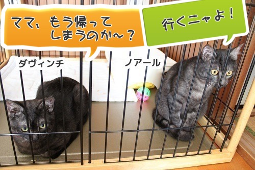 友人から昼休みに電話がありました 「夜、仕事が終わった後、ダヴィちゃん達を迎えに行っても良いですか?」 「もちろんOKよ。」 少し驚いてしまったけれど、本当に嬉しかったわ~。 友人が、積極的にニャンズとの交流を図ろうとしているのですものね。 いつもはママの方から打診して、家に遊びに来てもらっていたから・・・ 20時40分~22時35分までの2時間、 友人宅で、水入らずで過ごしてきましたよ。 帰ってくる前に、友人から電話がありました 友人の為に玄関灯に電気を点けると、 玄関扉の向こうに、薄っすら何かの影が映っています 不思議に思って扉を開けると、すでに二匹を入れたキャリーバッグが到着していました。 いやだ~ 夜分遅いと思ったのか、先に家に連れてきて、チャイムを鳴らさないで帰ってしまったようでした。 「電話のベルも、チャイムも同じだから、気にしないで良いわ~。」と伝えました。 それよりも、蚊が出始めているから、ダヴィちゃん達が刺されでもしたら大変ですものね。 ニャンズ、リビングに運んで、キャリーバッグを開けると 自分達のゲージに一目散に入ってしまいました ノアールは、3階の定位置に ダヴィンチは、喉が渇いていたのか、たくさん水を飲みました。 でもね、ママはとっても嬉しいの♪ セカンドハウスを友人宅に設置して良かったわ。 これからはいつでも遊びに行けるし、 土曜日には、お泊りだって試すことが出来るのですものね なぜもっと早くに思いつかなかったのでしょう。
