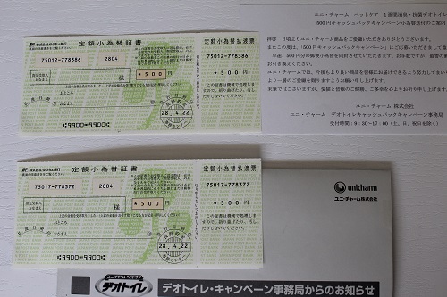 ユニ・チャーム ペットケア 1週間消臭・抗菌デオトイレ 500円キャッシュバックキャンペーンに、2口応募していたら 先日、郵便小為替が送られてきました。 GW中だけど、今日は平日だったので 銀行に行ったついでに郵便局にも寄り、換金してきました。 1週間消臭・抗菌デオトイレ、すでに我が家では6個購入しています(笑) だけど、【ハーフカバー本体セット】のみのキャンペーンだった為、2個分がキャッシュバックされました。 1週間消臭・抗菌デオトイレ ハーフカバー本体セット ナチュラルアイボリー【HL532P11May13】価格:1480円(税込、送料別) この商品、元々本体価格も高くなくて、砂とシートがセットになり、手軽に試すことが出来ます。 我が家での使い始めの記事はこちらから→★ そのうえキャッシュバックがあったから、本当にお買い得でした。 3月31日で終了した為、最後に購入したトイレは到着が間に合わず応募できなかったけれど 先日、実店舗にて猫グッズを物色中、再びキャンペーンが復活したのを知りました。 システムトイレを始めるのには良いタイミングですね (○´∇`)φ_銀座フルーツバウム_φ(´∇`●) 先日取り寄せた銀座フルーツバウム 毎日1個ずつ食べていたら、あっという間になくなってしまったわ(〃ω〃) 元々私は、甘いバームクーヘンが苦手だったけれど・・・ フルーツをたっぷり入れた上品な甘さなので大丈夫でした これなら、短い賞味期限でもまた取り寄せたいわ