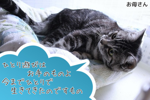 これまでの話はこちらから→(=^‥^=) ニャンコ お母さんの話を続けて書くつもりでいたのですが、前回からだと随分間が空いてしまいましたね~(´~`ヾ) ポリポリ・・・ ウールサッキングのシルヴィアにお漏らしをする美宇宙原因不明の皮膚病を患っているラスターと3ニャンに手が掛かるため、おりこうにしているお母さんの話はついつい後回しになってしまいました。 野良歴の長かったお母さんですが、実は、とても育てやすい子なのですよ。 おとなしくて、ひとり(一猫)遊びができるのです。 「吐き癖とウンチがトイレからはみ出すことがありますよ~ 」 お友達のブログで知ったおもちゃ 我が家では、どの子も夢中ですノアール&ダヴィンチも喜んでいました教えていただいてありがとう<(_ _*)> お兄ちゃん達は食べてしまうので、ママと一緒に遊びますがお母さんは、ひとりでも追いかけっこをして遊べます。 まるでネズミでも追いかけているかのように、嬉しそうに転がします。 3階の寝床に持ち帰り、クンクンしていたと思ったら1階に逃げてしまったボールをダッシュで追いかけます 椅子の足元に隠れて、忍び足でチョイチョイ・・・ やおら「ウンニャ~オ・・・グルグル」なんて奇声をあげたりして・・・見ていて飽きません( ´艸`)♪ おんにゃの子は、遊びが可愛くて、本当に良いですね~ヾ(^^ )ナデナデ...