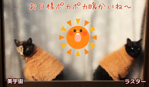 「猫ちゃん、ひなたぼっこしてますねぇ~」来客があると、必ず最初に口にする言葉です。 今頃の寒い時期、太陽の暖かい日差しを全身に浴びようとして南向きの窓に、ラスターと美宇宙が張り付いている姿が見えます。 10cmほどの建具枠に行儀よく並んだ姿 ガラス越しのぼんやりとしたシルエットを見ていると微笑ましく思えます ところで気付いたでしょうか?お揃いの洋服を着ているでしょう( ´艸`)♪ 去年の集団風邪を予防する為に、今年は早めに、ラスターと美宇宙に洋服を着せました。 ラスターは、上手にお布団の中にもぐることができるので、すぐに脱げてしまいます。 部屋の片隅に、落ちた洋服を見つけると、蝉の抜け殻を見つけたような気分になってちょっと面白いですよ♪ 猫は毛繕いをします。犬用の洋服を着せると、グルーミングの妨げになってしまいます。だから、肩口から腰の辺りまでのケープです。お腹にゴム紐を1本通し、グルグル回らないように工夫しています。 美宇宙はお布団にもぐることができません。 ラスターが赤ん坊の時から手塩にかけて育てたので何でもラスター任せです。不器用だけれど、そこがまた可愛いです フワフワの敷毛布の上にちょこんと寝ると、フリース素材のケープが、掛布団の役目をしてくれます。