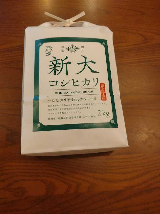 年々気候が厚くなっていく日本、今年は、テーマとして「暑さに強いお米(=高温耐性があるお米)」を少しずつ重点的に紹介しています。⇒「きぬむすめ」「いなほっこり」「とちぎの星」「あきさかり」この先、気候条件と照らし合わせて高温耐性の品種が求められると思いますが、作り手さんは「これまでの品種と比べて作りやすかったとしても知名度がない分高く売れない」といった悩みを抱えているようです。もちろん、暑さに強いだけで作りやすいわけではない、といった品種もあるようです。そして、コシヒカリ王国新潟では、なんとコシヒカリに代わる高温耐性米として「コシヒカリに高温耐性を持たせる」という研究が本当に行われています。行っているのは新潟大学。品種としては、正式名称は「コシヒカリ新潟大学NU1号」という品種であり、正式にコシヒカリと名乗れるわけではないんですが、新潟県内12カ所で栽培の実証実験を実施し、「新大コシヒカリ」という商品名で、販売しています。立派な紙製の袋に入ってます。値段も結構行くんでしょうねぇ、と言われそうですが「はい、お高いです」。「コシヒカリ新潟大学NU1号」の特徴この品種については、情報があまりないため「新潟大学社会連携推進機構のnote」より引用します。・「新大コシヒカリ」は、新潟大学農学部(当時)の三ツ井敏明特任教授らを中心とした研究グループが開発、一般的なコシヒカリと比べて高温耐性を持つことから、2020年に「コシヒカリ新潟大学NU1 号」として新品種登録(登録番号:第27856号)をした。・「新大コシヒカリ」という名称は、2022年11月から約1か月半の間で行われた一般公募で選ばれ、、最終選考の結果、地域に親しみのあるコシヒカリの名を残すことができる「新大コシヒカリ」に決定した。・開発経緯は、近年の猛暑の影響で「コシヒカリ」の収量の減少やコメ白濁化といった品質低下の被害が県内全体で発生し、この課題の解決に向けて取組みました。当初三ツ井特任教授は「高温によりコメが白く濁るのはなぜなのか」という学術的興味から研究を開始した。・研究の結果、イネのうちコメとなる部分に含まれるデンプンの合成と分解のバランスに着目し、そのバランス異常がコメの白濁化といった品質低下の原因となっていることを突き止めまた。そして遺伝子組換えではなく、イネが本来もつ環境適応力を引き出すことによって、暑さに強く高温耐性を有する新品種「新大コシヒカリ」の開発を行った。ということのようです。その後、2020年から県内7カ所で試験栽培を実施し、2023年からは新潟や東京の百貨店で試験販売をしてきたそうです。販売については、「お米場 田心」を運営している「農業生産法人 越後ファーム株式会社」が担っているようで、今回はお米場 田心さんではないページ(新潟直送計画さん)から注文したのですが、販売者および発送元は越後ファームさんでした。開封してみます次回に紹介する商品が一緒に入ってます。左の新大コシヒカリ「コシヒカリ新潟大学NU1 号」、右は新潟大学の付属農場で作ったいわゆるコシヒカリ「コシヒカリBL」になります。BLについては、次回の記事で少し詳しく説明します。裏面です。販売者は、農業生産法人 越後ファームさん原料玄米は、コシヒカリ新潟大学NU1号となっています。精米はこんな感じです高温による白粒化に関心があったのが出発点、という品種だけにキレイです。それでは、いただきます口にした食感と食味は、コシヒカリそのものでした。ややもっちりした食感と、ほのかな甘み。とても美味しいです。基本的にコシヒカリは濃い肉系の料理でもそれなりにご飯のおいしさが残るのですが、スペアリブと一緒に戴いても美味しく頂けました。この他、サーモンとカツオの刺身があったのですが、しょうゆをつけた上で合わせていただくととても美味しかったです。もったいなくて、丼ものの土台にはあまりしませんでした。さて、前回の記事を読んでくださった方はお分かりかと思いますが、一つ前のお米は古古米の政府備蓄米でした。口にした瞬間から、味が全く違いました。そして、今回驚いたのは我が家のチビどもの反応です。お刺身が好きというのもありますが、チビ1(小学校高学年)、チビ2(未就学児)ともに評判がよく、ごはんのお替りの所望がありました。チビ2に至っては2膳です。実は、チビ1は習いごと教室のみんなでむかし行った新潟のスキー教室でのホテルの食事にいい思い出があるらしく、以前も書きましたが「新潟県産コシヒカリ贔屓」です。なので、このお米を出す際にわざと新潟県産の「新大」コシヒカリという品種だということは黙ってました。それでも、美味しいと感じる舌を持っているんですかね。ごちそうさまでした。注文はこちらから私自身は、こちらの「新潟直送計画」さんから購入しました。令和6年度産米 新大農学部コシヒカリセット(新大コシヒカリ・農学部コシヒカリ 各2kg) 新潟大学農学部