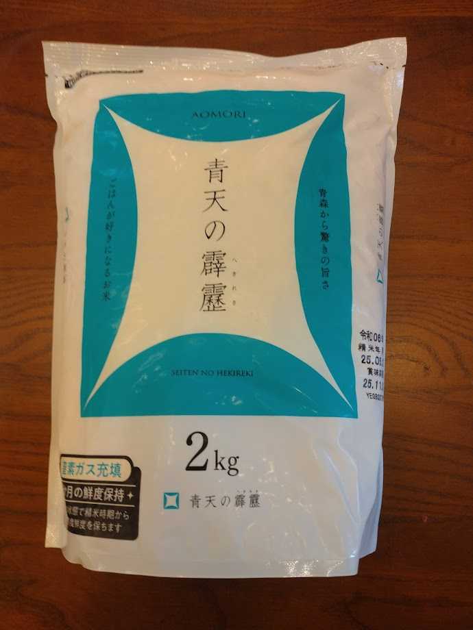 こちらも、以前紹介した「コシヒカリ」と同様に窒素充填型長期保存米になります。昨年のいわゆる「米騒動」では、どこの店舗に行っても商品がなく踊らされた苦い経験から、手元に何kgか脱酵素剤入りの、精米後長期間食味が保たれるお米を購入しておきました。価格は高いですが、こればかりは子どもを抱える身の保険と思い割り切ってました。購入価格は、税抜き2199円でした。備蓄米放出で値下がりした今となっては、高値で掴んだ感があります。今回、新米が出回る時期に突入し始め、隠し持たれていたと思われる在庫も外に出てきて、金額はともかくとして去年の米騒動のように「店頭でお米が手に入らない」という状況はどうやら避けられそうだという判断で、開封を始めています。今回は、近所のまいばすけっとに5月頃に並んでいた「青天の霹靂」です。その名称から、銘柄としてはもちろん知っていましたが、購入するのは今回が初めてです。青天の霹靂の特徴青森県産業技術センターが2006年に開発を開始して、2014年に販売を開始した品種になります。この品種が2015年に受賞するまで、青森には「特A評価」を受賞した品種はありませんでした。ちょうど、昨年(2024年)青森県米本部が公表した「青天の霹靂10th Anniversary」というサイトおよびその提供先の青森米本部のホームページをベースに細かい紹介させていただきたいと思います。『「青天の霹靂」は粒がやや大きめのしっかりしたお米です。ほどよいツヤと、やわらかな白さ。炊き上がりからしばらく保温していても、つぶれることのない適度なかたさがあります。食べごたえがあって、しかも、重すぎない。粘りとキレのバランスがいい。上品な甘みの残る味わいです。』、『粘りとキレのバランスが良く、上品な甘みの残る味わい。どんな食材と合わせてもおいしく、おかずを選ばない頼もしさがあります。「ごはんの魅力」をあらためて感じさせてくれるお米です。』というのが売り物で、「さっぱり・おいしい」がキャッチコピーになっています。栽培には生産者登録が必要となっており、生産管理がきちんと行われています。栽培地域は、青森県産業技術センターによると、「津軽中央地帯」となっています。これがどこを指すのか、まとまっている資料を見つけられずイマイチ難しかったです。地理学科を出ている私ですらコレです。青森市と弘前市の間にある五所川原市、板柳町、鶴田町などが当てはまり、青森市と弘前市自体は含まれないようです。一応、「青森米本部」にある青天の霹靂の栽培エリアがあったので転載します。出典:https://aomori-komehonbu.gr.jp/meigara/系譜は、北陸202号(夢の舞)/青系157号のF1種と、青系158号によるものとなっており、青森色のかなり強い品種になっています。ちなみに、青森県の品種別栽培量(検査数量ベース)です。以前紹介したつがるロマンが奨励品種から外れ、生産量が大幅に変化しています。これは、「はれわたり」に移行したことになっています。青森県全体としては、まっしぐらが生産量の4分の3を占め、かつ全国的な品種「あきたこまち、ひとめぼれ、コシヒカリ」の生産が殆どないという特徴があります。それだけ、東北地方の他県と比較しても気候が厳しいんだろうということが想像できます。「青天の霹靂」は、この中で第3位の生産量となっていますが、県全体の生産量で見れば1割未満です。パッケージはこんな感じです精米年月日は5月、賞味期限は精米から180日後になっていました。裏面です。「青」は青森の青、「天」ははるかに広がる北の空、「霹靂」は稲妻という説明書きがあります。販売者さんはMMライスさん。このMMは「ミツハシ・丸紅」のM2つでしたが、現在ではミツハシの100%子会社になっています。精米はこんな感じです白く透き通っていて、粒立ちしそうな見た目です。この時点で、結構楽しみです。それでは、いただきます「さっぱり、おいしい」がキャッチコピーだと書きましたが、さっぱり感が結構強かったです。どちらかというとササニシキ系列でしょうか、あるいは感覚として似ているものがあるとしたら、産地が全く異なりますが「京式部」や三重のブランド米「結びの神」あたりが近そうな気もします。いまこの記事を書くにあたって、答え合わせのようにJA全農の食味チャートを参考までに見たところ、「結びの神」がすぐ近所にいました。自分の舌が合っていたようで恥をかかずにすみました。付け合わせのおかずは、さっぱり系なのでお刺身や和系の野菜ものがよく合いました。カツオの刺身や、菜っ葉のお浸しあたりとの相性が良かったです。ごちそうさまでした。購入したのは東京南部のまいばすけっとですが、その後この長期保管米を見かけていないことから、「購入はこちらから」は省略します。