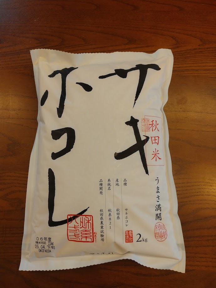 このブログを「作ってみよう」と思うきっかけになったサキホコレです。一昨年の春、秋田県内での親族の結婚式に参列した際、職場へのお土産を買いにアトリオン(秋田総合生活文化会館)の中にある県産品コーナーに行きました。この時、食品から工芸品まで山積みになっている中、どセンターともいえる場所にデビューしたての秋田米のサキホコレが山積みされていて、「秋田人は米を土産物だと思ってるのかよ」と秋田生まれの自分でさえ驚き、呆れました。この時、帰りは秋田空港から飛行機だったのですが、空港の土産物屋にも積んでありました。今回は、ふるさと納税の返礼品として注文をかけていたお米(次回紹介予定)が、GW前後の連休が理由なのかなかなか届かなかったため、急遽つなぎで何かを購入する必要が発生しました。前回「楽しい食卓」を購入した際に訪問したイトーヨーカドーへ学用品を探しに行く用事があったので、せっかくならヨーカドーのお米PB「あたたか」に何かいいものがないかと探しに行きます。が、2kg米は「つや姫」「ゆめぴりか」が1袋くらいずつあるだけで、あとはめぼしい(このブログで未紹介という意味での)品種はありません。それならと、その横にあった当ブログ未紹介の「サキホコレ」を買ってきました。サキホコレの特徴平成26年に秋田県農業試験場が開発に着手し、令和4年より本格的に出回りました。父は、以前紹介した良食味秋田米の「つぶぞろい」、母は愛知県生まれの「中部132号」になります。秋田県のホームページ、「ごはんのふるさと秋田へ」によると、コシヒカリを超える極良品種米をコンセプトに、食味に徹底的にこだわって開発されたとのこと。食味の特徴は・白さとツヤが際立つ外観・粒感のあるふっくらとした食感・上品な香り、かむほどに広がる深い甘みだそうです。実際に、食べた感想としてもこの3つはすべて満たしていました。栽培特性は、「あきたこまち」より成熟期で9日遅い晩生種で、高温や低温による品質劣化が少ないそうです。東京のスーパーでは、それなりの品種を置いている見せであれば1列確保されています。ヨーカドー、ライフ、東急ストア、西友、マルエツ(小さ目の店舗にはない)あたりではよく見かけ、他のブランド米と比べると味の割にやや安いように見受けられます。理由は知名度でしょう。パッケージはこんな感じですパッケージ再掲です。系統名「秋系821」 品種開発「秋田県農業試験場」となっています。裏面です。販売者は木徳神糧さんです。前回の記事で、木徳神糧のブレンド米を探しにヨーカドーへ行きましたが、今回のサキホコレもこちらでした。ヨーカドーのお米は、おおむねこちらに押さえられていますので、そうなるでしょう。精米はこんな感じですごめんなさい。いつものお皿がどこかへ行ってしまったので、今回のみのこちらを使います。透き通った外観がいいですね。それでは、いただきます。口にした瞬間から、ふっくら感が広がってきました。ただし、甘みはあまりありません。この直前まで、備蓄米の入ったブレンド米を戴いていたので期待大だったのですが、口にした瞬間は「外観はきれいだけど甘くないな~」と感じる位でした。とはいえ、上述したように口にした瞬間よりも、「噛むことで甘さが出る品種」なんです。口の中では、「あ、優しい甘みのあるいいお米」に代わるのでご心配なく。この特性なので、ご飯だけで食べても美味しいのですが、おかずとしては肉系で汁気の少ないものが、特に良かったです。豚の味噌漬けとか。でも、カレーの土台にもしてしまいました。ゴメンナサイ。その他そうそう、Facebookが勝手に拾って来てびっくりしたんですが、「みつひかり」に関するデマがまた出回ってるみたいですね。みつひかりは人工的なコメで、「吉野家の米はみつひかり」なんですって。いや、今の吉野家は違いますし、人工米でもありません。まず、品種は民間企業が開発しただけで、野菜の種などでも見かけるような単なる収量の多いF1種です。この国では、遺伝子組み換えは徹底的に忌避されるので、作ろうにも作れないのが現実です。そして、みつひかりは2022年以降、種子が出荷もされていません。その理由は、実は「種子産地偽装等の不正がばれたから」っていう、身もフタもない理由なんですが。なので、鵜呑みにされる方はそんなに多くないと思いますが、吉野家さんに怒られてもしかたないですね。ただし、外国産を含んだブレンド米を使用しています。