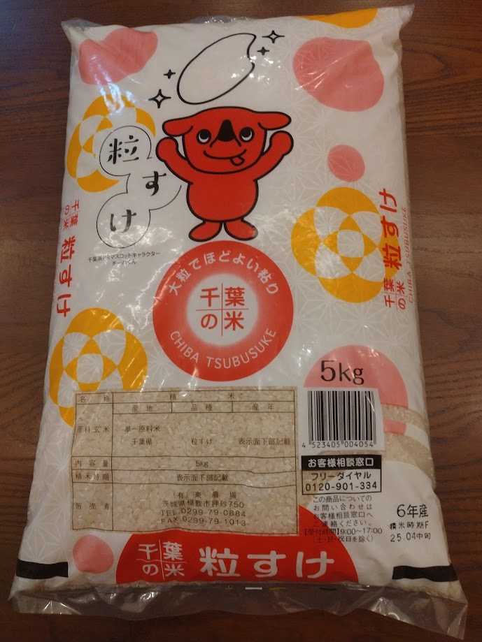 未就学の子供のいる我が家では、「バターチキンカレー」を重宝しています。普段のカレーは、甘口と辛い者の食べたい大人用の辛口を、カレールーを入れる段階で2つの鍋に分けているのですが、バターチキンカレーであれば1つの鍋で作れます。ハウス食品のカレー、「こくまろ」シリーズに「こくまろバターチキンカレー」という商品があって便利なのですが、取り扱いがあまりありません。以前は東急ストアやマルエツで取り扱いがあったのですが見かけず、確実に手に入る店として、毎週川崎に行く機会のあるkomenumaは、川崎駅ビル地下にある「Y’smart(ワイズマート)」さんで時々何個か買い貯めています。そんなワイズマートさん、本社は千葉県の浦安にあり、千葉県や東京都の千葉寄りを中心に展開している会社のようで、神奈川は川崎の1店舗だけです。お米に関しては普段はパールライスの商品や千葉県に本社のある「ユアサ・フナショク」さんの無洗米などを扱っていて、精米コーナーはあまり気にしていなかったのですが、先日通りがかったときに、このお店で見たことのないパッケージがありました。千葉県産の粒すけで、販売者は茨城県内の農場になってました。もしかしたら千葉の流通業者のつながりから、スポット購入した商品かもしれません。その日は購入しませんでしたが、一期一会かもと思い、次の週に川崎に行くときに購入してきました。購入価格は、税抜き4,600円です。この商品に限らずたいていの「粒すけ」には、千葉県のキャラクター「チーバくん」が袋に描かれています。粒すけの特徴千葉県が13年かけて開発した品種で、2020年にデビューしました。公式サイトがあるので、そちらから情報を引用すると、・粒が大きい・程よい粘りと弾力で、コシヒカリと同等以上のおいしさ・和食・洋食・中華など、色々な料理に合う食感・コシヒカリよりもたくさん収穫できる・茎が短くて倒れにくく、育てやすいという、食味および生産上の特徴があります。千葉県の品種別生産量になります。生産量のうち、おおよそ48%をコシヒカリが占めており、次いで「ふさこがね」(28%)、「ふさおとめ」(13%)の順となっており、「粒すけ」(5%)はそれらに次ぐ第4位となっており、全体としての生産量はそれほど多くありません。千葉県は、コシヒカリを全国でも最初(新潟県と同時)に奨励品種としてきた歴史があり、それ以外の品種では台風の影響を受けづらい早生種の「ふさこがね」「ふさおとめ」の栽培が進められてきたことが理由としてあるのかもしれません。パッケージはこんな感じです再掲です。「粒すけ」の特徴ともいえるチーバくんが前面に出されています。裏面は、保存方法と炊き方です。販売者は、茨城県稲敷市の(有)東農場さん。千葉県でしか作れないはずの米なのになぜ、と思いましたが生産者から集荷販売までする業者さんのようです。かつて、「とねのめぐみ」の際に書きましたが、この稲敷市や対岸の千葉県成田市のあたりは利根川を挟んで経済圏は結構ボーダーレスです。東農場さん自体も、千葉県成田市に倉庫を持っているようです。精米はこんな感じですこの画像だとそうでもないんですが、これ以上に白い粒が混じっていた印象を受けました。おおかた2等米なんじゃないでしょうか。「粒すけ」の特徴で高温耐性は聞きませんし、コシヒカリ等と同様に白くなっているものと思われます。それでは、いただきます粒が大きいうえ、母がコシヒカリなこともあって食べやすい品種でした。コシヒカリ程は甘くないですが。汁かけご飯よりも汁気のないおかず、たとえばエビフライなどの揚げ物との組み合わせが良かったです。「ご飯だけで食べてもおいしいか」という質問があれば、それだけで食べられる品種だと思います。また、機会があればリピートしたいです。ごちそうさまでした追記小泉農相による備蓄米放出の話以降、楽天でもその他のEコマースでも、民間の米穀業者からのお米の供給量は明らかに増加しましたね。タイムラグを考えると、JAが放出する時間はまだなく、最大の原因はJAよりも民間米穀卸業者の売り惜しみ(一番最初の指摘通り)だったんでしょう。当初から想定していましたが、やっぱり感が強いです。