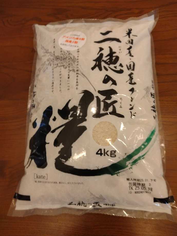 GW頃、イオン系のスーパー「まいばすけっと」に並び始めていたお米で、店頭で見て気になっている商品がありました。米国産米メインなんだけど、いわゆる「カルローズ100%」などではなく、国産米を2割だけブレンドした商品で、昨今の米価格よりも安く供給できるお米として出されているようです。(イオングループのプレスリリースはこちら)正直なところ、なぜ2割という申し訳程度の国産米ブレンドをしているのか、意図がわかりませんでした。そのうち買ってもいいかなと思ってはいたのですがとりあえずは様子見してました。ところが、5月の中旬にイオングループから「カリフォルニア米カルローズ100%の『かろやか』を6月6日より販売します」というプレスリリースがありました。そうなると、この商品は存在意義を失ってしまうかもしれません。欲しければ「今でしょ」ということで近所のまいばすけっとに行くたびに入荷状況を見ましたがが、日曜午後の入荷直後の状況でも2kg米やブレンド米「あかふじ」、はえぬきは入荷していてもどうもこれが棚に並んでいません。機を逸したと思っていたのですが、子どもの習い事送りのあと、生活圏ではない地点のまいばすけっとで遭遇できたので、衝動買いしました。購入価格は税抜き2780円。ただし4kgです。パッケージはこんな感じです。「二つの故郷を持つ銘柄米の長所を損ねることなく、匠の技の米作りで見事に一つの美味しいお米に仕上げることが出来ました。ぜひ一度、お召し上がりいただきたい逸品です」とあります。裏面はお米の炊き方です。アメリカ米だから水加減をどうするとか、浸水時間は~とかそういった記載はありませんでした。裏面を見て驚きました。イオンが販売者だとばかり思っていたのですが、販売者さんは米穀卸最大手の神明さんでした。「二穂の匠・糧」の特徴ブレンド米なので特徴は書けませんが、生産国以外の情報が一切ないことが特徴ですかね。米国米ですが、カリフォルニアなのか、それともアーカンソーなど他の稲作州のものなのかはわかりませんし、先入観でカルローズかと思っていましたがそれも不明です。2割の国産米部分も、新米なのか古米なのか、どの品種なのか、どの産地なのかといったことは不明です。精米はこんな感じです思っていたほどは、中粒種という感じではありませんでした。それでは、いただきます輸入米だからといって、匂いなどこれといった悪い特徴はありませんでした。ちょっと前に戴いたブレンド米「楽しい食卓」と、それほど変わらない食味です。komenuma嫁:「ブレンド技術の凄さを思い知った」コシヒカリ好きチビ1:「やっぱり味がしない気がする・・・」感じ方はそれぞれですが、自分は・土台としては全然アリ・おかずと一緒に戴くにしても、オールマイティーにいける→ただし、お米だけで食べても美味しくない→「ひのひかり」のようなオカズの邪魔をしないいい米とはまた違う。という感じ方でした。購入当初に抱いていた、「なぜ2割ブレンド?」という疑問は解けました。2割程度のお米で、食感が大きく変わるんでしょうね。炊き方は少し工夫が必要で、通常よりも5%以上10%未満位多い水量で炊いた場合に、それなりに美味しく炊き上がります。炊飯器の分量通りに炊いた場合には、ボソボソします。料理酒1匙でも加えれば、外国産米だとわからない美味しいお米になると思います。ごちそうさまでした購入したのは、蒲田近くの「まいばすけっと」ですが、首都圏のまいばすけっとなら入手できるかもしれません。ただし、小泉備蓄米の放出とカルローズ100%の販売が始まった今、いつまでこの商品を生産するのかはわかりませんが。