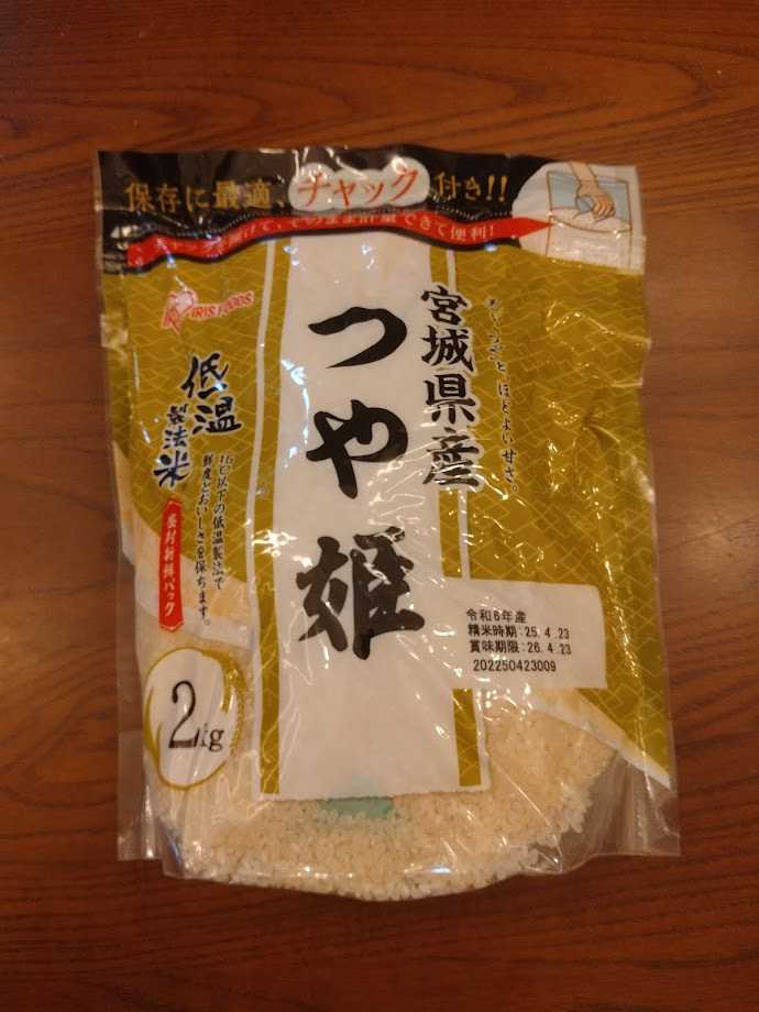 以前紹介した「青天の霹靂」「ゆめぴりか」と同じく、見かけたときに「念のために」購入した長期保存米です。購入店は、大田区馬込の「ドラッグセイムス」です。昨年の米騒動の際に、「ふさこがね」が入荷していて一息ついたあの店舗になります。販売元は、宮城県に本社があり、家電製品メーカーの印象が強い「アイリスオーヤマ」さん。こちらは、宮城県産のお米を中心に扱っており、店舗で見かけることも時々あります。大型店だと、ホームセンターのUnidyがアイリスオーヤマ系列の為取り扱っているのをみたことがあります。つや姫の県外栽培このブログの初期の記事で書きましたが、つや姫は開発者の山形県による商品管理が行われています。以下は上記記事からの引用ですが、「山形県は「つや姫」を「はえぬき」のような地域銘柄ではなく、全国区として知名度を上げ市場を広げるため、他県が奨励品種として採用した場合に種子を提供する戦略を取っています。ブランドや品質の保持のために、種子提供を受けた各県は、自県でつや姫の品質管理を行います。この制度で種子提供を受けた県は、隣の宮城県のほか、山梨県、島根県、大分県、長崎県、和歌山県などに広がっています」。この戦略は当初からのもので、平成21年に「つや姫」と命名する際にも、隣接県の宮城県等での奨励品種採用を目指すために「山形県」、「出羽国」(山形・秋田の旧国名)が入るような命名を避けたという経緯があるようです。つや姫の県別生産量2位は宮城県です。1位の山形県のほぼ半量を栽培している、と聞くと驚く方もいるかもしれません。私も、ここまで多いとは思ってませんでした。西日本(島根・大分・長崎)でも栽培されているのはこの品種が山形発祥なのに暑さに強い点もあるんでしょうか。高品質な商品を置くコープこうべで大分県産を見たことがあります。宮城県内の品種別生産量です。これもこれで驚きでして、圧倒的なひとめぼれ王国の宮城ですが、2位に来るのは、かつて一世を風靡した「ササニシキ」でも、いま売り出し中で首都圏のスーパーで見かける「だて正夢」でもなくて、「つや姫」なんです。パッケージはこんな感じです表面は再掲です。低温製法米と書いていますね。精米日は4月23日で、消費期限は1年後の4月23日です。ちなみに、購入したのは5月の下旬です。裏面には、「低温製法」+「密封新鮮パック」による鮮度保持の説明があります。販売者は「アイリスフーズ」さん。アイリスオーヤマの子会社でしょうか。精米はこんな感じですつや姫らしい、白さが際立った粒でした。それでは、いただきます。「つや姫」は相当前に山形県産をいただきましたが、同じように口当たりがよくほの甘さのある上品なお米でした。炊飯してみると、その白さも良くわかります。眼でも楽しませてもらいました。丼物や土台にするよりも、おかずと一緒に食べる方が美味しいです。そして、コシヒカリ等との違いは、味が上品なためおかずが肉だとどうしても負けてしまう気がします。ひじきの煮つけなどとの組み合わせの方が美味しく食べられました。ごちそうさまでした