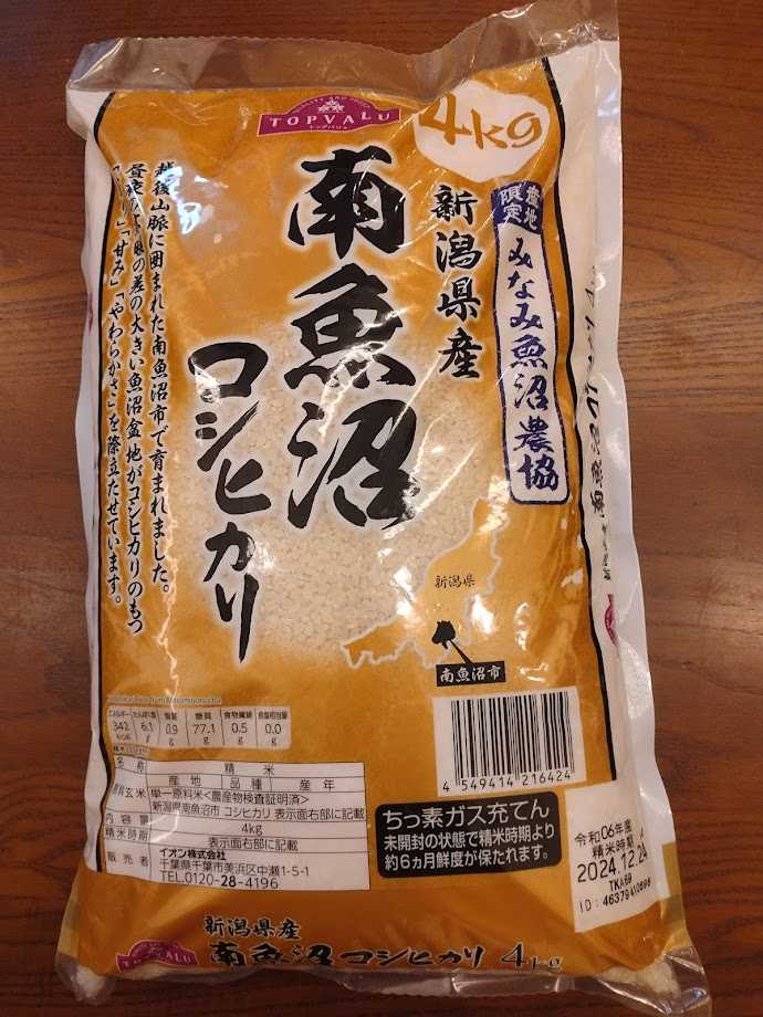 昨年の米騒動を機に、「万一店頭から一時的に米が消えた時用に、ある程度長持ちする精米を1袋取り置いておきたい」と考えるようになりました。精米の消費期限というものは法的にはなく、「1年」が目安とされている一方で、実質的に美味しく食べられる時期は精米日から夏が1か月、冬でも2か月程度と言われています。店頭でも、精米日から日付が経過したものが値引きされていることがあります(例:マルエツ)が、これはそういった理由によるものです。その一方で、これまでに紹介してきた商品の中にもあったのですが、窒素充填や真空化によって食味の低下を抑え、6か月~1年程度の間であれば美味しく食べられますと謳っている製品があります。(紹介したものだと、てんたかく・岡山の里海米・ハイブリッドとうごう(冬眠米)・いなほっこりなどがあてはまります)今年の初め頃、「そういう商品を買ってみてGWごろに開封して、食味がどんなもんなのか試して、もし悪くなかったら代わりを買えば、夏の端境期を乗り越えられそうだ」と考えていました。ちょうど、近所のまいばすけっとではイオンのPB”トップバリュー”ブランドのコシヒカリとミルキークイーンの窒素充填米が売られていたので、これでテストしようかと購入してみました。購入日は1月4日で、購入価格は、4kgで3400円程度(今よりはまだ安かった)でした。このシリーズは、他に「つや姫」があるのを大田区六郷土手のイオン系スーパー、maxvaluで3月頃に確認しています。今回、精米日の12月24日からちょうど半年が過ぎそうなことから開封してみました。購入したのはこちらです「産地限定 みなみ魚沼農協 南魚沼コシヒカリ」みなみ魚沼農協のHPを見る限りでは、管轄地域は南魚沼市と南魚沼郡湯沢町(越後湯沢のあるところ)のようですが、こちらの商品の産地は南魚沼市のようです。販売者は、米穀業者ではなくイオンです。裏面は、南魚沼地域の紹介ですが、右下に気になるQRコードがあります。イオンのtopvalu商品は、どうやら産地情報についてのトレーサビリティがあるようです。表のパッケージの番号「TKA69」を入力してみました。出てきた情報は、生産地、生産者団体、精米地、商品名が出てきます。精米地は、米穀卸大手神明の東京工場(埼玉県ですが)になっています。まいばすけっと、MMライス(ミツハシ系)の商品が多く、申し訳程度に神明さんの商品があると思っていたのですが、がっちり食い込んでいたんですね。精米はこんな感じですそれでは、いただきます特別栽培でも従来品種でもなんでもないですが、それでも生産地から正式に認められる「魚沼コシヒカリ」です。前回紹介した「日米合同ブレンド米」から一気にランクアップした気分で、食べる前から美味しそうです。人間とは、そもそもブランドに弱い生き物です。口にしてみます。味はコシヒカリでした。上品な甘みがあって美味しいです。少なくとも、「半年前に精米したロングライフ米だからダメ」等ということはありません。が、何か物足りません・・・食感なんです。もちもち感が少ないというか、食感がボソボソするんです。原因はすぐわかりました。食味は保てても、水分抜けまでは保てていないんでしょう。(炊飯機変えたのが原因かな、とも思いましたが)次の日、気持ち水を多めに入れてみたら美味しく炊き上がりました。いわゆる「美味しいコシヒカリ」だったため、ロングライフということについての不満は不安はありません。合うおかずも、コシヒカリに合うオカズと同じで、飲み屋さんの持ち帰り手羽先(たれ味)との組み合わせや、味が強くても負けない豚キムチとの相性が良かったです。自称、新潟コシヒカリが好きなチビ1も、正体を明かさずに出したのですが「うまい」と平らげてくれました。ごちそうさまでした購入はこちらから本来はイオン系列の店舗で購入できますが、最近は見かけません。これを購入した「まいばすけっと」に入荷されるお米は、現時点で限られているためあまり役に立たないレビューかもしれません。「食べられる」ことがわかったので、端境期の緊急用のお米はまいばすけっとで「青天の霹靂」、ドラッグセイムスでアイリスオーヤマの「つや姫」をそれぞれ2kgずつ買い置きしました。夏過ぎに記事にすることになると思います。
