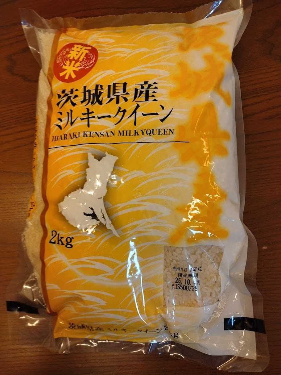 9月末のふるさと納税制度変更前に、いくつかの自治体に11月配送予定の注文しました。もう一つ、10月末にJAタウンでも2kg米を一袋注文しましたが到着せず、どれもいつ着くのかがの確証がないまま、コ・ノ・ホ・シの在庫があと2日分というところまできました。このため、11月の3連休に東京南部にある近所のマルエツで、2kg分のつなぎを購入しました。狙っていたのは、普段のあっさり、大き目、粒立ちがいい品種を試したがるkomenumaの普段の嗜好からは真逆の位置にあるミルキークイーンです。前々回に新品種「ゆみはりづき」を紹介したときに、開発業者さんの農家さん向けパンフレットにあった、「ミルキークイーンが作りたいが栽培が難しく収量も獲りにくいという方に向いています」、という言葉を思い出し、ゆみはりづきの記憶が薄れないうちに久しぶりにミルキークイーンを食べたい、しかもゆみはりづきと同じ茨城県産なのもいいなと、久々の購入です。比較的メジャーな銘柄のミルキークイーンですが、このブログでの紹介は初めてです。komenuma嫁も、「たまに食べるにはミルキークイーンもいい!ハンバーグか焼肉が必要かなぁ?」とノリノリでした。ミルキークイーンの特徴開発の経緯は、文献を参考にしながら書いてます。平成元(1989)年から平成6(1994)年にかけて、農水省では「需要拡大のための新形質水田作物の開発」(別名:スーパーライス計画)という、米の消費量を上げるための新品種を育成しようという国家プロジェクトが行われていました。子ども(小中学生)向けのものですが、農山漁村文化協会さんのホームページに「スーパーライス計画」というページがあり、わかりやすくプロジェクトがまとめられています。そこからの引用ですが、1.色や大きさがスーパーライス赤米のベニロマンや、紫黒米のあさむらさき、大粒米のオオチカラ、小粒米の関東170号2.かおりや味が良いスーパーライス長粒香り米のサリークイーン(カレーやピラフ向け)、低アミロース米で粘りの強いミルキークイーン(←今回紹介のこいつです)、高アミロース米でパラパラになるホシユタカ3.体によいスーパーライス胚芽の大きい北海269号、低タンパク質でアレルギーが出にくくなるのではないかと開発されたLA-1、低グルテリンで、腎臓病患者に効果があるのではと開発されたLGC-1などが当てはまります。この中で、さらなる品種改良が行われたものもあれば、この時点の品種が残っているものもあります。2.のサリークイーン、ミルキークイーン、ホシユタカは今でも手に入ります。ミルキークイーンの開発開始自体は、実はこのスーパーライス計画よりも古く、1985年よりスタートしています。コシヒカリにニトロウソウレア誘導体(MNU)突然変異源処理を行ったのちに突然変異した種がベースとなっており、系譜図のような話をすると、コシヒカリの変異体ということになるようです。1992年から各府県で試験栽培を行い適応性を調査し、1998年に水稲農林232号として品種登録されています。栽培特性は、元の品種となる品種のコシヒカリとほぼ同様に、関東であれば早生種となり、倒伏しやすくいもち病耐性が弱いようです。これで、コシヒカリ早場米産地の茨城や千葉、三重のミルキークイーンが早場米で出てくる理由がわかりました。また、「栽培が難しい」という話も、コシヒカリの弱点と同じ弱点があるということになりそうです。県別生産量です。栽培地域は全国に広がっていますが、上位5位に来るのは茨城・福島・長野・新潟・滋賀の順です。コシヒカリの生産上位5県は、新潟、福島、茨城、栃木、富山、6位が長野なのを考えると、比較的コシヒカリと同じ傾向と言えそうです。パッケージはこんな感じです裏面はこんな感じです。ミルキークイーンとしての特徴等は、特に強調されていませんでした。販売元は大手のMMライス(ミツハシ子会社)です。販売者欄だけの拡大画像は撮り忘れてしまいました。すみません。精米はこんな感じですこれまでにミルキークイーンを頂いたときには意識していなかったのですが、乳白色が結構強いです。そして、結構小粒なんですね。同じ属性に分類されやすいコメに「ゆめぴりか」がありますが、ゆめぴりかのように開封した瞬間にわかる「甘い、あるいはミルクやバニラのような匂い」はありませんでした。それでは、いただきます過去に食べた時の印象より、もちもち度は高いけど極端に甘くもないなという印象でした。ゆめぴりかに近い属性と認識してましたが、ゆめぴりかとコシヒカリの中間よりは、コシヒカリよりかもしれません。極端な癖もなく食べやすいです。おかずなしで、そのまま食べてもおいしい。ミルキークイーンということで、合わせるおかずは肉系がいいはずですが、ギョーザが結構合いました。あとは、鶏手羽先から揚げのたれ漬け(居酒屋の店頭持ち帰りメニュー)ともいい相性でした。逆に、朝に永谷園のお茶漬けで1杯戴いたのですが、これはやっぱ