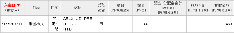 460円 最近は円安により配当金をすべて円転してるため再投資はありません。2023年より楽天証券が配当金円受け取り設定ができるようになったため、ドルではなく円表記です。
