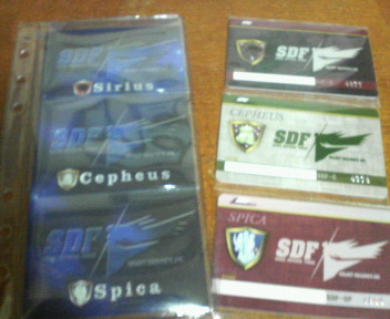 DVD BOXも第3集が発売し、『銀河鉄道物語~永遠への分岐点~』も一段落といったところでしょうか。今シリーズを一言で言い表すのなら、最初から最後まで本当にやきもきさせられたシリーズでしたね。これから数回に分けて、その感想をつらつらと書いていこうと思います。今回はDVD BOXとその特典の話。左はDVD BOXを並べた写真。スピカ小隊とフレームスワロー、シリウス小隊とビッグワン、そしてケフェウス小隊と飛竜のそろい踏みです。非常に構図も良くていい絵柄なんですが、いかんせんキャラクターそれぞれの表情がいまひとつ。やはり作画に難のあったシリーズだったと痛感させられます。BOX背面の画像も3集合わせると一枚になるわけですが、これもまたいい感じです。キャラクターの数が少ない分、こちらの方が安心して見ていられます。そしてファン失笑のBOX特典・SDF隊員証。上から順にシリウス小隊、ケフェウス小隊、スピカ小隊です。左側にあるのはBOX第3集の特典の隊員証収納用カードフォルダー。正直いりません。サプライズとして声優さんによるキャラクターのサイン入りのものが封入されていたそうですが、はたしてそれがあるからといって購買意欲が上がるかというと疑問です。もちろんあくまで私には、ですが。前作『忘れられた時の惑星』のDVDの時にはブックレットやサントラが封入されていたにもかかわらず、今作ではそういったものが一切ありませんでした。残念でなりません。DVD BOXは各3巻の全3集のなので全9巻になります。BOX発売と同時にレンタル版もリリースされるわけですが、BOX特典だとされたTV未放映の第25話、第26話が収録されておらず、それぞれの巻での収録話数にズレが生じています。この点については次回以降、述べていこうと思います。しかしまぁ何というか恨み節満載になっちゃったなぁ。