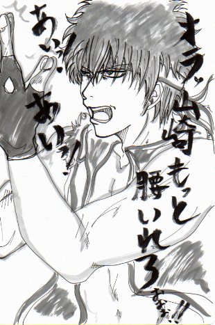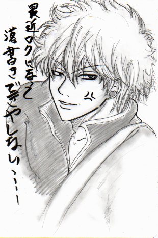 ど~も~。最近仕事の合間を利用して用事を詰め込んでます。この間は母様と新宿に行く用事がありその帰りに池袋のなんかかんやという焼肉屋で飲んでました。 その店にマヨタンとゆう品がありなにぃぃいマヨだと!!銀魂ファンならではの反応ですね‥持ち!注文!!自分だけ異様にテンション上がってましたwwマヨネーズがのっかてるタンだったんですが(゜o゜)w美味かったです!!!タンにマヨネーズあうよ!土方さん!そして昨日は高校時代の後輩が働いてる築地近くの小料理屋に行き飲んだくれてきました~ もぅ、めっさもっさ刺身が新鮮そのもの♪自分雲丹があんなに旨いと思いませんでした♪しまいにゃサービスやら色々してもらい、5千円以上食べたはずなのに2千円にまけていただきゴチになりました(ゞε<;)最近贅沢尽くしですな。さて、今回の落書き~またまた銀さん~ 最近銀さんしか描いてない気がしますw(゜゜)wたまには他のキャラ描かんとね…