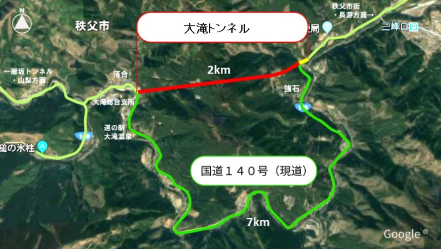 7月11日に発生した秩父市大滝地区国道140号線が落石事故で通行止めとなっていました復旧には約4ヶ月程度かかる見通しとのことですが建設中であったほぼ完成に近い状態にある「大滝トンネル」(全長2053メートル)を暫定的に通ることができるようになったため秩父方面から車で三峰神社へ行くことが可能となりました場所はこちらです’(秩父市役所HPより引用)ただし暫定的開通ということで時速15kmという速度制限がありますトンネル内はまだ砂利道のところもあるようですまた、バイク及び自転車、徒歩での通行は出来ません詳しくは埼玉新聞yahooニュースをご覧下さいませこちら
