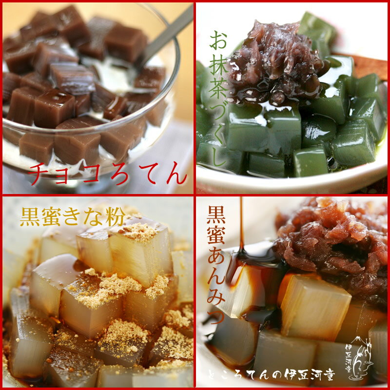 明日から、もう2月ですね。2月といえば、バレンタインシーズン。ちょっとひと味違うバレンタインプレゼントに、「チョコろてん」はいかがでしょう。「チョコろてん」、何ともお茶目なネーミングその名の通り、チョコレート風味のプリプリッとした角切りところてんに、コーヒー味のコクのある蜜とミルクフレッシュが、不思議にベストマッチした新感覚の美味しいスウィーツです。スウィーツと言っても甘すぎず、カフェオレ味&ちょっとビターなカカオ風味で、さらっとした何とも言えない美味しさは、まさに大人にピッタリなデザートです。上の写真のように、季節のいちごを添えると見た目も華やかな洋風デザートに♪。ヤミツキになって、たくさん食べても、1個107kcalなので安心です。カロリー気にする方に!チョコレート色のカカオ入り角心太に珈琲蜜...価格:420円(税込、送料別)今年のバレンタインは、義理チョコ代わりにちょっとお茶目な「チョコろてん」にしたら、きっと喜ばれそう(*^-^*)。お味見用にぴったりなのは、今の季節限定の「チョコろてん」と、とっても美味しい定番のあんみつ「お抹茶づくし」「黒蜜あんみつ」「黒蜜きなこ」3種、合計4種類がセットされていて、しかも送料無料のお徳用セット♪。【自家消費包装】 河童のあんみつ簡易パックセット -送料無料-【...価格:1,285円(税込、送料込)「お抹茶づくし」は、角切りところてんも蜜も香り豊かな抹茶入り。「黒蜜あんみつ」「黒蜜きなこ」も、甘味処で味わえる本格的な和風定番のとっても美味しいあんみつです。今なら、期間限定で、写真のように2セットで「チョコろてん」が1個オマケ。3セット購入で、「チョコろてん」3個のオマケ付きです。わたしは、近頃ところてんダイエットにハマっていて、というより、自分用にまたリピしちゃいそうです。