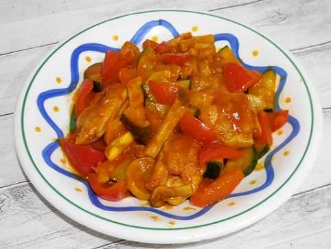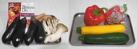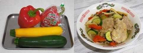 材料は、こちらの赤パプリカ、黄色と緑のズッキーニ