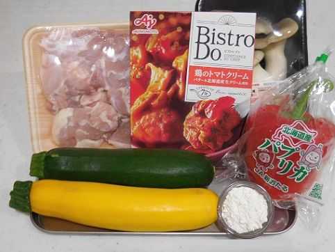 赤パプリカ、緑と黄色のズッキーニ、そして鶏肉にまぶす小麦粉です。