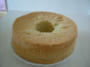 日曜にこないだ料理教室で作ったレシピでシフォンケーキを焼いてみた♪卵白に砂糖を入れずに塩をひとつまみ入れて泡立てるのでどこまで泡立てて良いかわからなくなってきてしまい・・やや泡立てすぎたかな?という感じに。気にせず卵黄と合わせて型に流しいれ・・・うちでは180℃で35分位焼いてたんだけど、今回は200℃で20分。・・がしかし15分位の時にすでに膨らんでいる上の方がコゲコゲ(;O;)慌てて温度を下げて5分焼いて怪しかったけど焦げてるし完成!にしちゃった。逆さにして冷ましていると、焦げている所以外どんどん生地が凹んでいってるよ(>_