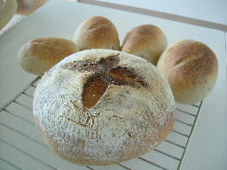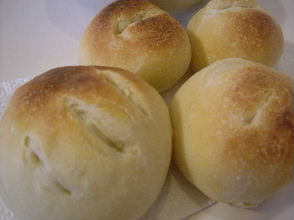 昨日早速焼いてみたパン、発酵が終わって焼きあがったのは夜9時。晩御飯も終わったこんな時間にパンって^_^;しかも、酵母の元気が良いのか私の腕が悪いのか(←確実にこっち)中身が飛び出してしまってるよ~~(>_