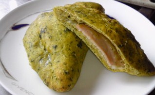 生地に茹でたほうれん草50グラムを混ぜ込みました。中身はチーズ・ハムです。ふくらみ良い。ほうれん草少なめのほうがよかったです。ハム・チーズがしょっぱいです。