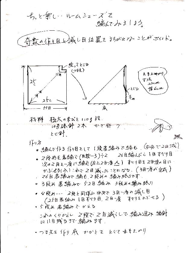 ルームシューズ講習会に出席してきました。出席者は40人くらいでした。講師の先生の説明通りに編んだら、小さくなってしまいました。簡単にでき、早い人は2時間くらいでカバー片方が完成しました。私の感想は1、10号針で編み進めれば完成品が縦横20センチくらいになる。2、閉じ目がルームシューズの底になり、痛みやすい。3、足の履き口を保護していないので傷みやすい。4、甲部分の折り返しが無駄。という理由で「いまいちな編み図」と思いました。極太毛糸で55目作り目し、2段ごとに中央で三目一度をしながらガータ編みします。11目までになったら、絞って閉じます。