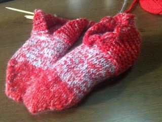 還暦のおばあちゃんのために作っています。本当は赤い毛糸が余っていたからです…。(*^_^*)こうしてみると赤い靴下かわいいです。かかととつま先が濃い色で、真ん中が薄い色に配色しましたから、足が小さく見えるかも…。「くるぶし」まで長さがあるので、足全体を包み込み暖かいです。