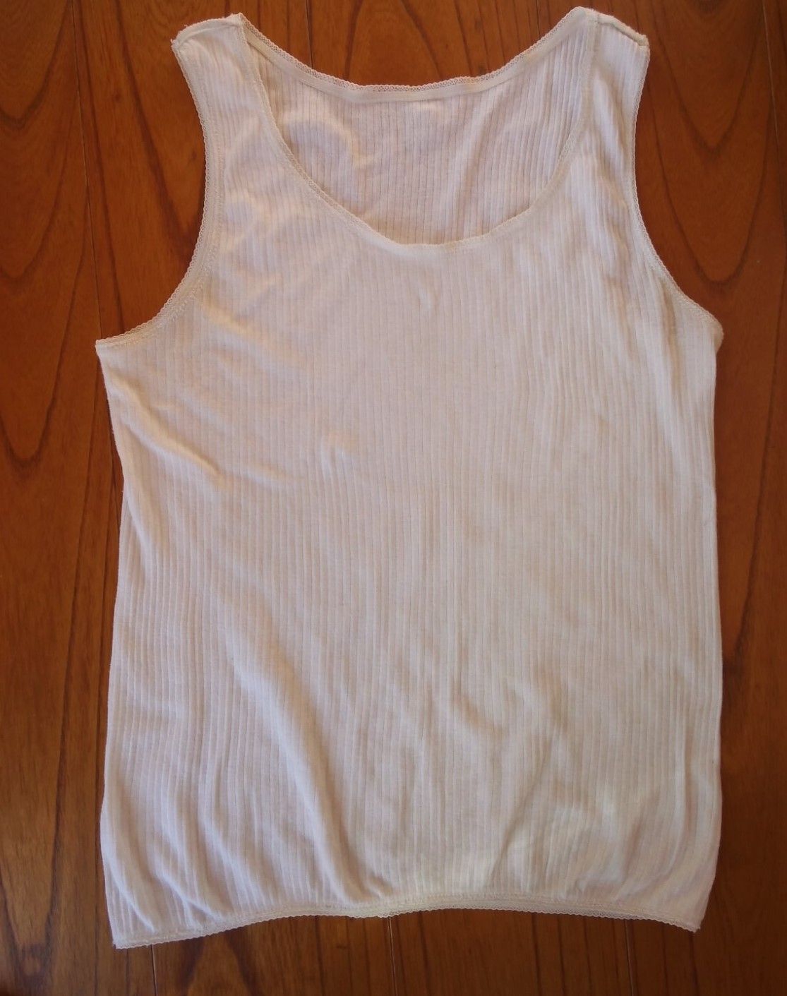 洗っているうちに小さくなったタンクトップの下着です。作り方前襟周り中心と後ろ襟周り中心を合わせて縫う。三つ折りにした裾にゴムを入れる。使い方上下さかさまにし、袖口から足を出し着用します。特徴へそ上まで包み込むデカパンです。反省・感想脇を縫うこともなく、ハサミも使わないのでほつれ縫いをする手間がいらず、早くできた。着用感は大きくてぶかぶかしています。へそ上まであり大きいです。おなかが暖かそう。「袖口に大根足が入るか?」と心配したが、入った。