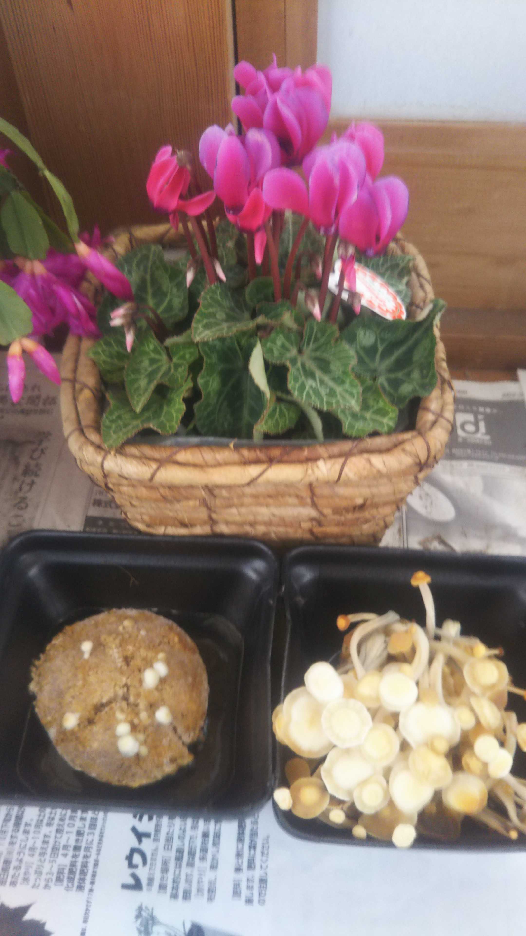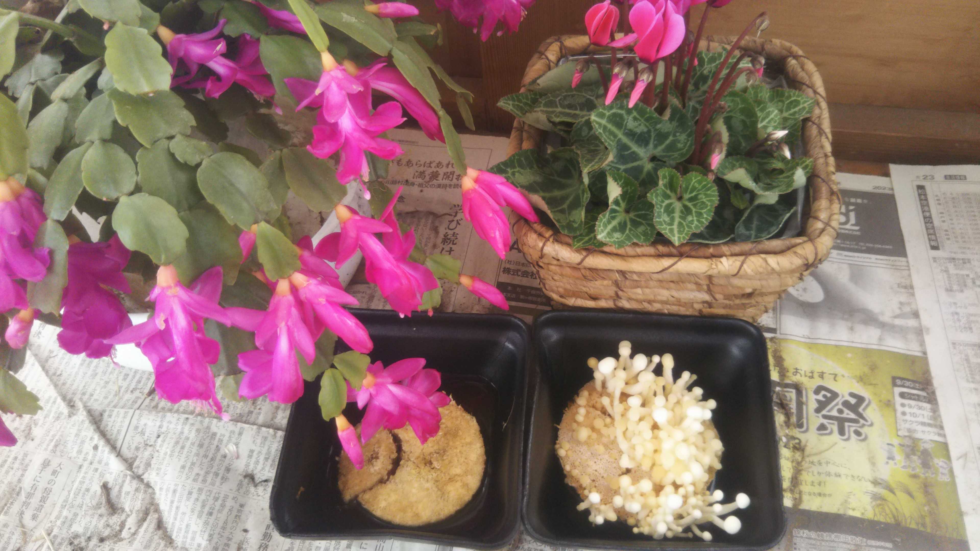 いままで捨てていた「えのきだけの株」を水につけておいたら芽が出ました。日当たりの良いところにシクラメンなどと一緒に使い終わったえのきだけの株を置いておいたら発芽しました。(右下)気をよくしてさらにもう一つ株を追加しました。(#^.^#)(左下)