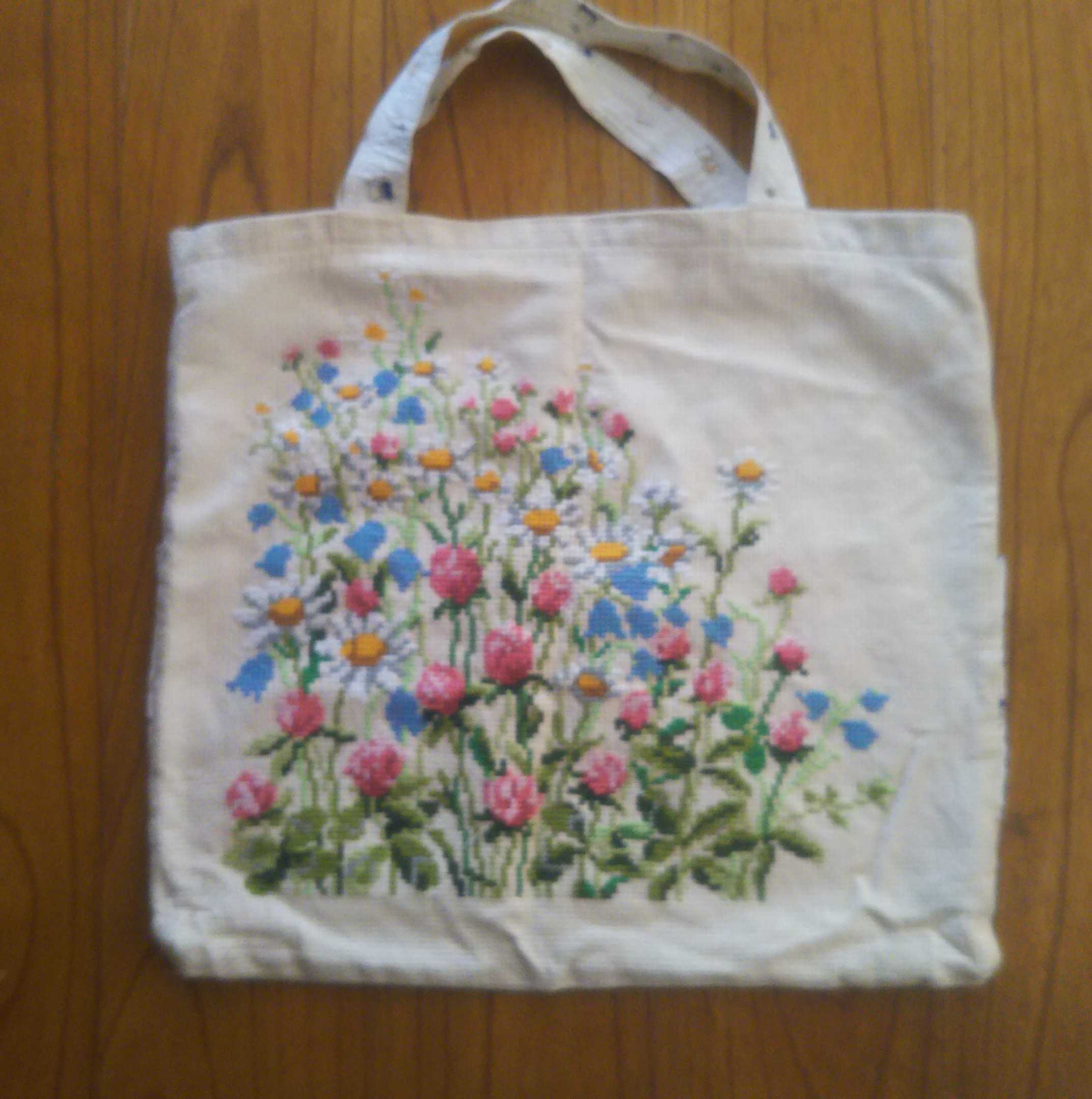昔作ったクロスステッチ刺しゅうのバッグ。色は「ベージュでおとなしめなところがいい」と思ったが、「汚れが目立ちそう」で使わなかった。「持ち手」と「ポケット」に柔らかそうな木綿を使ったところもいまいちでした。木綿のプリント柄も表の刺繡に似合わなかった。木綿なのでふにゃふにゃして自立できないバッグのため中身を出し入れしずらかった。そんなわけで使わないでしまっておいたが、クッションにリメイクしました。クッションにしても汚れが目立つベージュ色だが、使わないほうがもったいないから使います。クッションの中身は着用しなくなったふっくらしたダウンジャケット2枚です。ブラウスの袖を切り取りダウンジャケットを入れて下袋にしました。ダウンジャケット2枚とブラウス一枚と手提げバッグが、いっぺんにリメイクできました。(#^.^#)