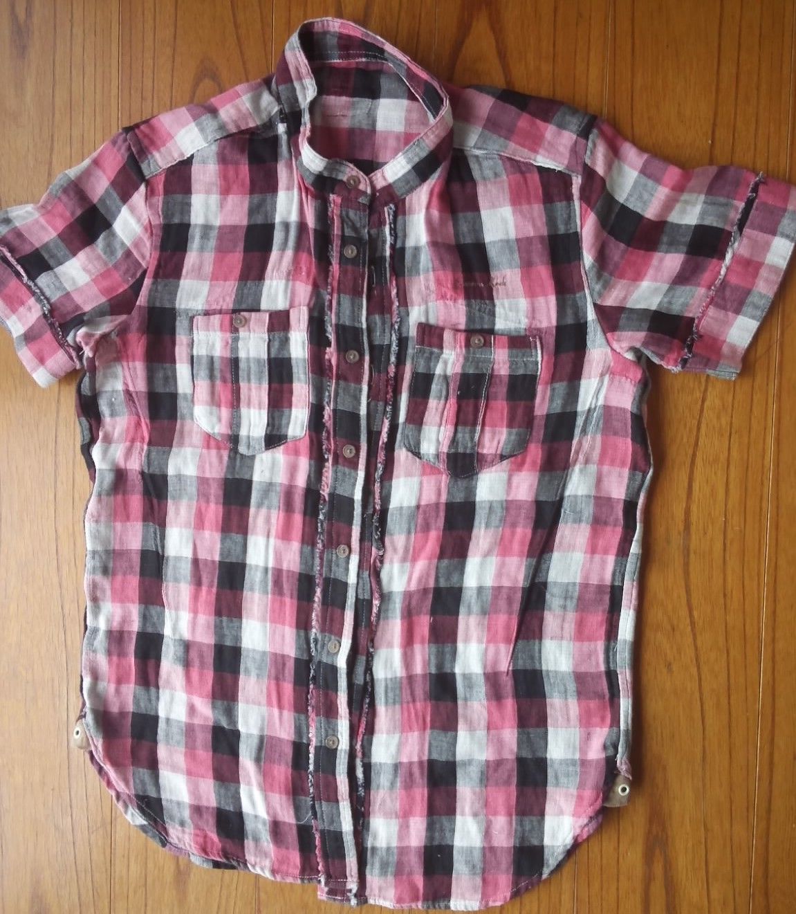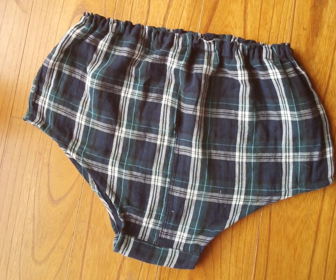 細い見頃でボタンが留められず着られなくなっていた、ブラウスでパンツ作りました。前身頃は白レース飾り、裾にはフリルがついていました。行動的なチェック柄に優しい白レースが個人的には「あわない感じの服」でした。二重ガーゼです。見頃を上下逆さに回転し、袖カーブから足を出すようにしました。足を出すカーブは三つ折り縫いです。ゴムは入っていません。脇はそのまま使いました。ウェストは三つ折り縫いし、ゴムを入れました。パンツが大きいので、着用した感じが、幼児になったようにかわいいです。お見せできなくて残念です。