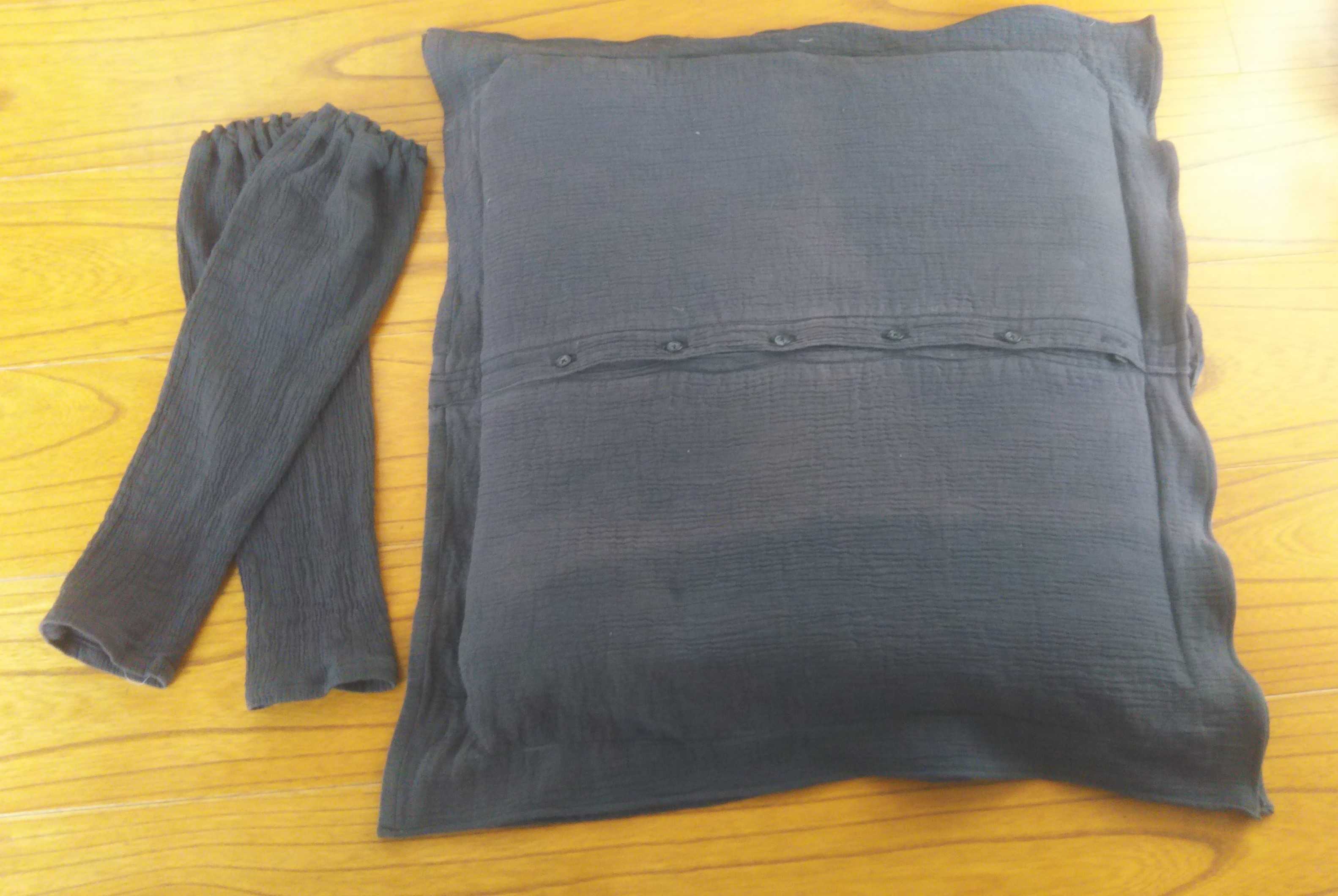 黒シャツブラウスから、車用クッションカバー&日焼け防止アームカバーにリメイク。クッションの出し入れは前身ごろだったところのボタンをはずして入れ替えます。長めのフリルは座席と背もたれの間に入れるとずれないかも…。アームカバーは手首のところはいじらず、腕上部にゴムを入れた。ゴムは使い捨てマスクから切りとったゴムです。助手席用に薄紫色ファーでクッションカバー作りました。出し入れ口は、紺色の樹脂ホックを3つ付けました。下部は5cmほど丈を長くして背もたれと椅子の間に挟み込めばずれないと思う…。