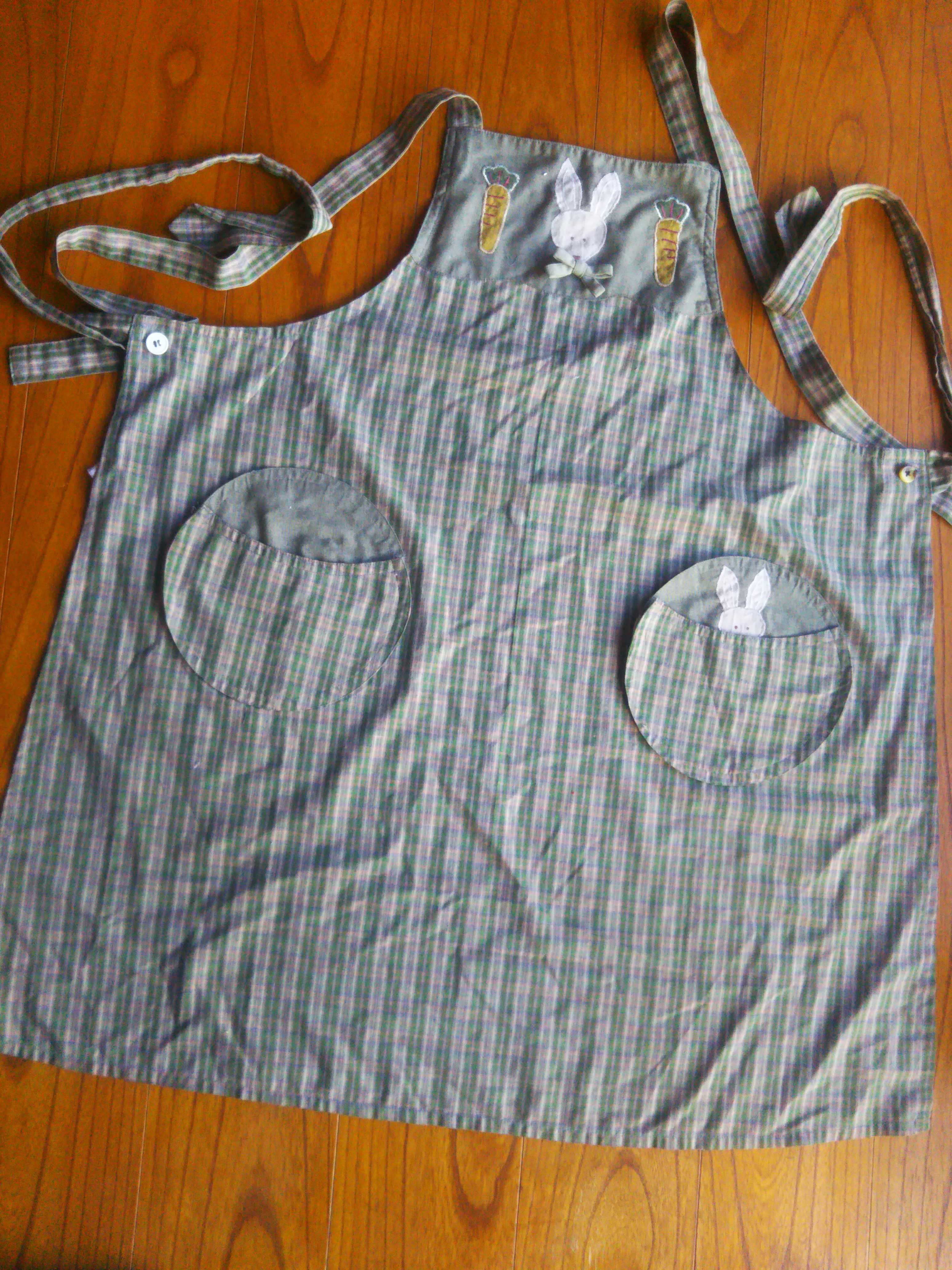 ちょっとかわいいエプロン子供が小さいときに使っていた思い出のエプロンウサギとニンジンがかわいくて台所用のアップリケかな?台所で使うウオールポケットにリメイクしました。よく作るレシピとメモ用紙、ボールペンを入れる。丸いポケットとひもはまた何かに使えるかも…