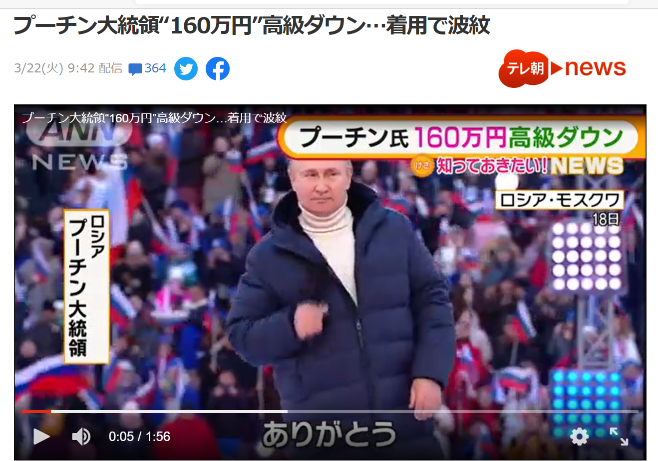 18日、ロシアのプーチン大統領は、20万人という大観衆の前で演説を行いました。ウクライナへの進行について、改めて正当性を主張しましたが、この時に来ていたダウンジャケットをめぐって、新たな波紋が広がっています。イギリスの大衆紙「デイリーメール」紙によると良質な生地に、厚みのあるフカフカしたダウンが暖かそうなジャケットです。イタリアの高級ブランド「ロロ・ピアーナ」のもので価格は日本円で、およそ160万円だということです。なかに着込んだセーターも2400ポンド(約37万円)英デイリーメール:「2021年のロシア人の平均年収は67万8000ルーブル(約77万円、プーチン氏のダウンジャケットの半額以下である)「グッド!モーニング」2022年3月22日放送分より