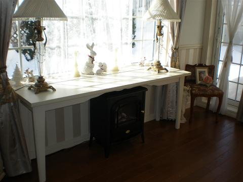 先日もご紹介したK様。 出窓と並べるテーブルです。 移動して食卓の横でも使えるようにと・・・! ストーブにかぶせるはずでしたが・・・・ 完成して持っていくと・・・あれ??なんか斜め? しかもかたかたいってるし・・・(^^;) 5m高さの内寸が足りなかった、、、(涙。 で、手前の支えの木を模様をつけてカットしました。 一緒にご注文いただいた窓枠・・・ 数ミリ合わず作り直して・・で、まだ合わずまた作り直し・・・ ”大工さんに頼んで今度は必ず!!!!”とうかがい3度目で成功♪ ほんと最近自分の採寸に自信が持てない・・(^^;) 私のメジャーがおかしいのかと思ってしまう 1度で終わるはずの配達・・・4度うかがいました。 そのたびにお茶を出していただき・・・ お茶を頂きに来ているみたいでスイマセン、、、、 でも笑って”またどうぞ”と言ってくださり・・ありがとうございました~(涙。 素敵に飾られているK様宅。 写真館の古いいすだそうです。 とてもかわいい!!! 思わず写真とって来ました(^^)