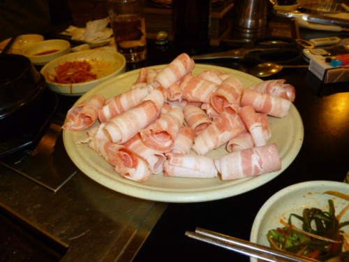 南浦洞の焼肉屋さん。もちろん豚の焼肉です。韓国、短期滞在でもやっぱ1食は豚だよね。かんなで削ったような豚肉、テペ。うす~いです。1人前が2500ウォンと激安。脂が気になるお店もあるけど、ここは大丈夫。脂が見事に落ちて、さっぱりとイケました。甘い醤油に漬け込んだデジカルビ。ここは、甘すぎたなぁ~。柔らかくって、甘くって、ちょっと年寄り向きかな(笑)。大好きなケランチム(茶碗蒸し)。無駄な具と味付けは一切なし。玉子好きには、韓国の茶碗蒸しはおいしいね。★辛くない韓国料理、いいですよ。ランキングに一票をよろしく!(ブログランキング ブログ村)
