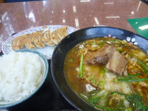 暑い夏には、餃子とスタミナラーメンでしょ!?スタミナラーメン食べて、ホントにスタミナつくのかなぁ(笑)?スタミナラーメンセットは913円。スタミナラーメン、ごはん、餃子、お漬物のセット。ボリューミーだけど、値段が値段だもんね。もうちょっと辛くっても大丈夫だよ~~~な程度のしょうゆベースのスープ。麺がとってもたよりない。ねえさんの道案内よりたよりないって感じ(笑)。そこにお野菜とチャーシュー。スタミナつけるのには野菜だね。チャーシューは柔らかくってウマウマよ。餃子、もうちょっとパリパリ感が欲しかったな。具沢山の餃子は、食べ応えはあるね。もちろん完食。大食いには適度な量で満足。でもね、スタミナつけるには、こんなに炭水化物食べちゃダメでしょ?★夏には、梅干かなぁ~。ランキングに一票をよろしく!(ブログランキング ブログ村)