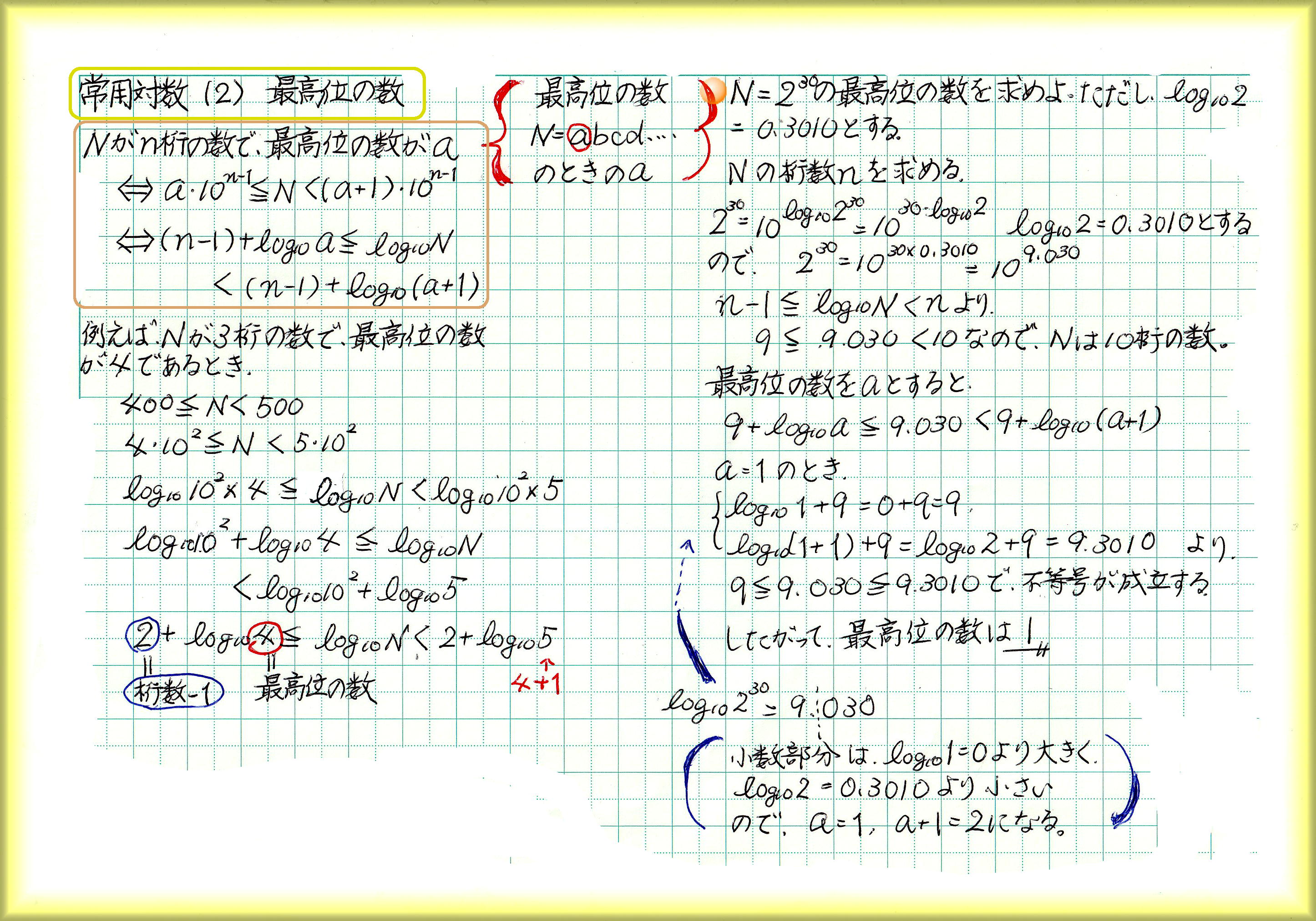 2の30乗の数は、10の何乗になるかを考えて、桁数を出します。例えば2の30乗が10の9.03乗なら10桁の数です。10の何乗になるか換算するときに使われるのが10を底とした常用対数です。