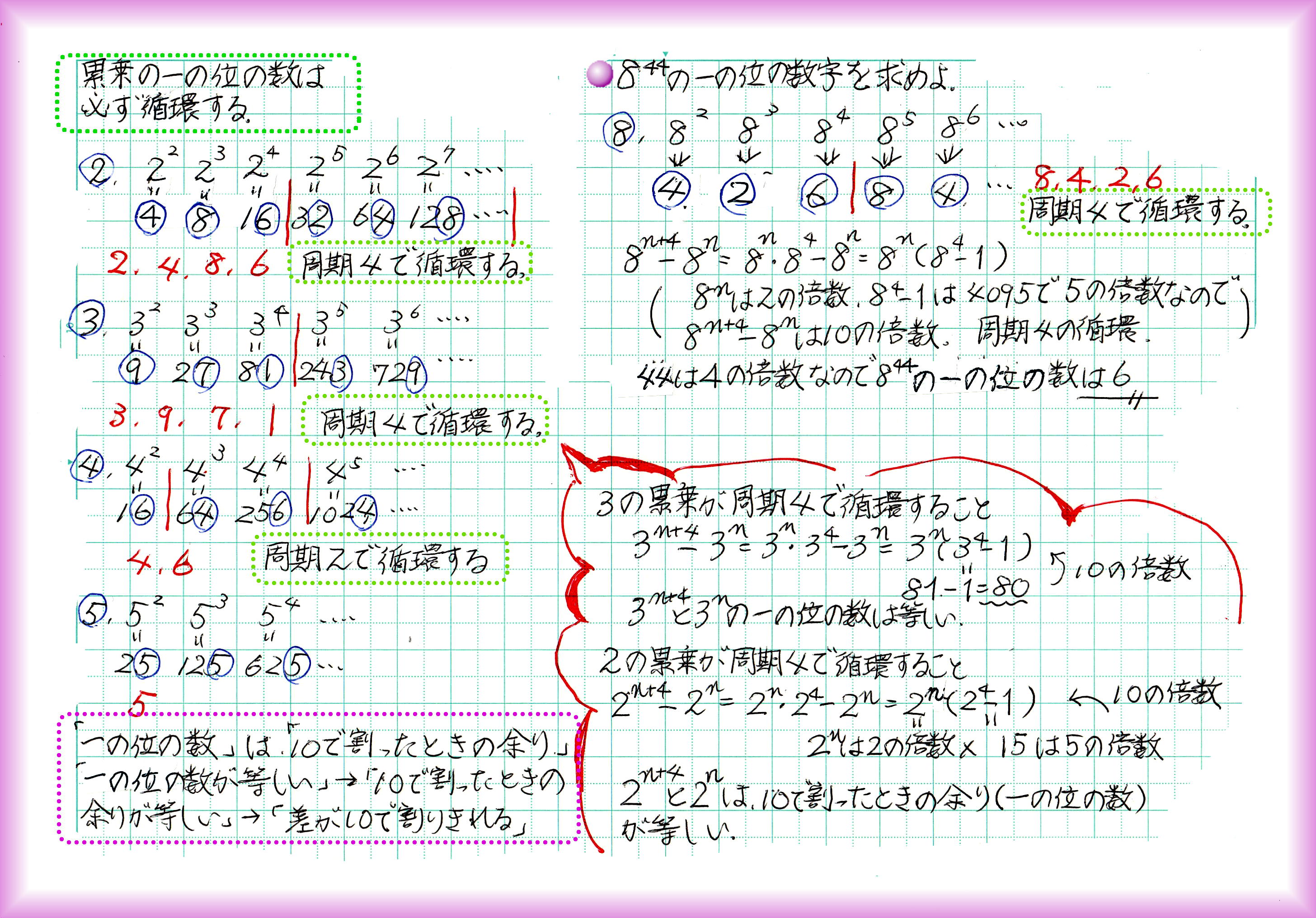累乗の1の位は循環するという性質があります。2、3、7、8は周期4で循環します。4と9は周期2、5と6は周期1です。