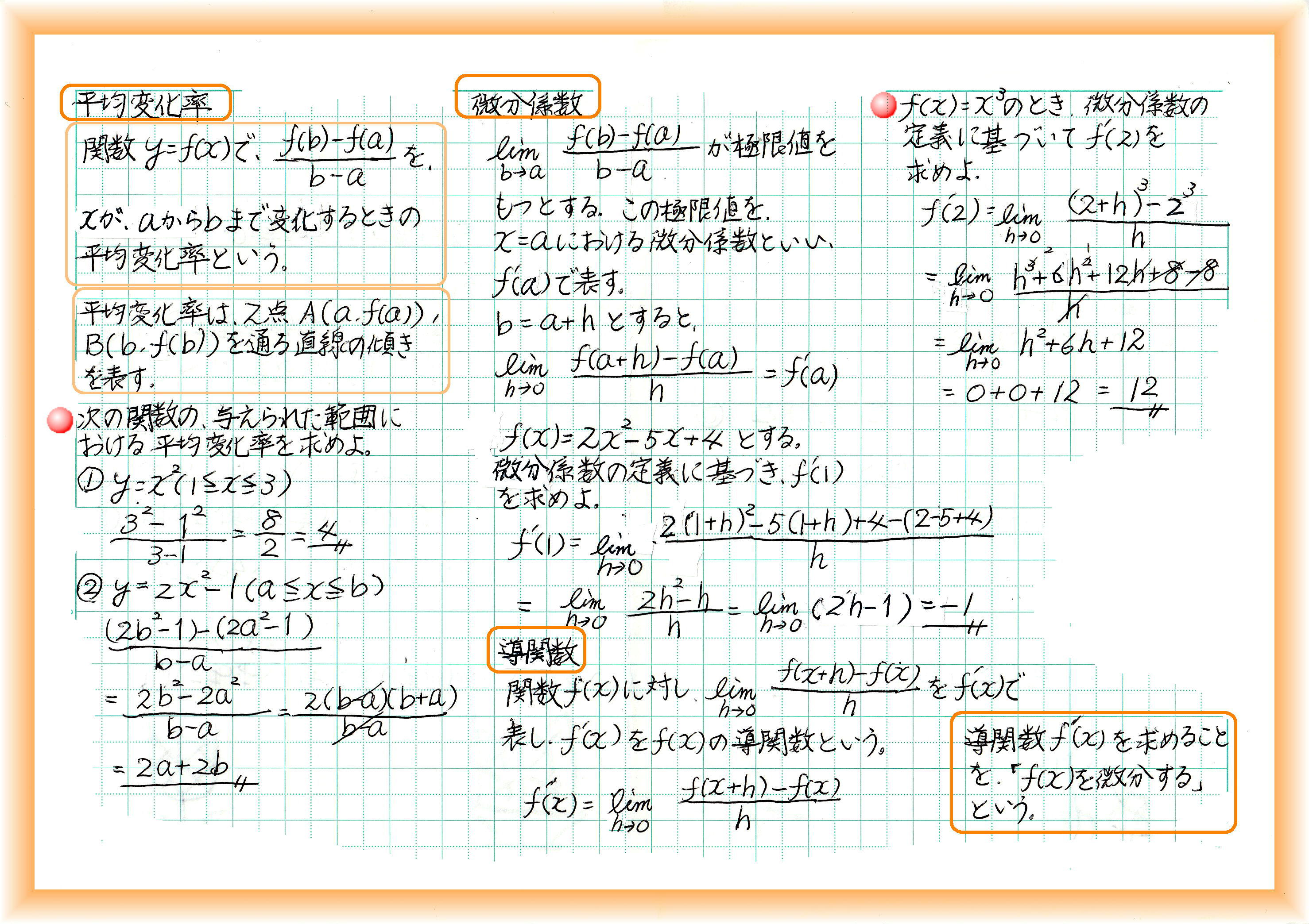 「平均変化率」の考え方は、小学校の算数から具体的な数で習ってきました。aからbまでの変化率は、2点を通る直線の傾きになります。