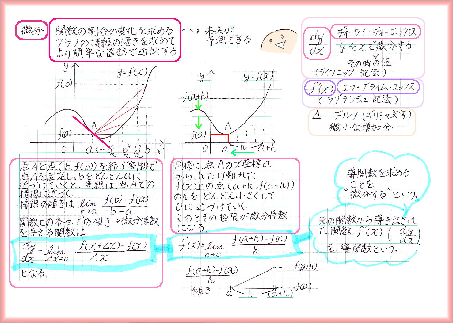 微分って見慣れない記号も出てきて難しいですね。上図が微分の概要なのですが、初心者には??です。1つ1つ整理して頭の中に入れていく必要がありそうです。