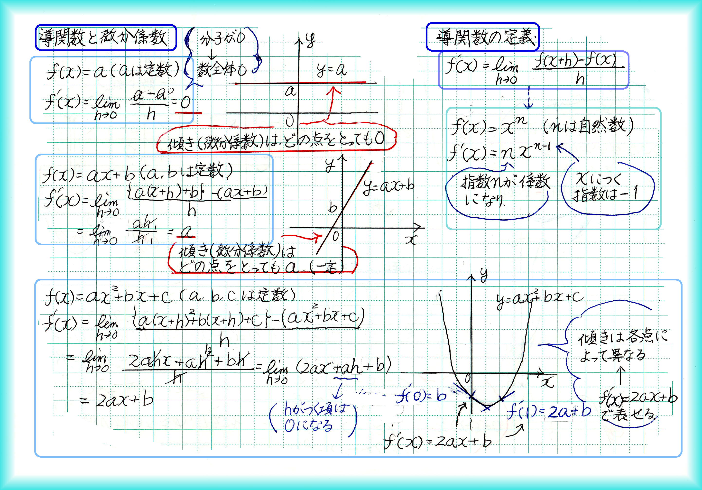 具体的な数値である微分係数に対して、関数上のどんな点にもあてはまる接線の傾きを「関数」で表したのが「導関数」です。導関数は、具体的な値ではなく、Xを含む関数になります。ただ、f(x)=9のような定数関数は導関数が0になり、f(x)=9xの1次関数では導関数が9という定数になります。