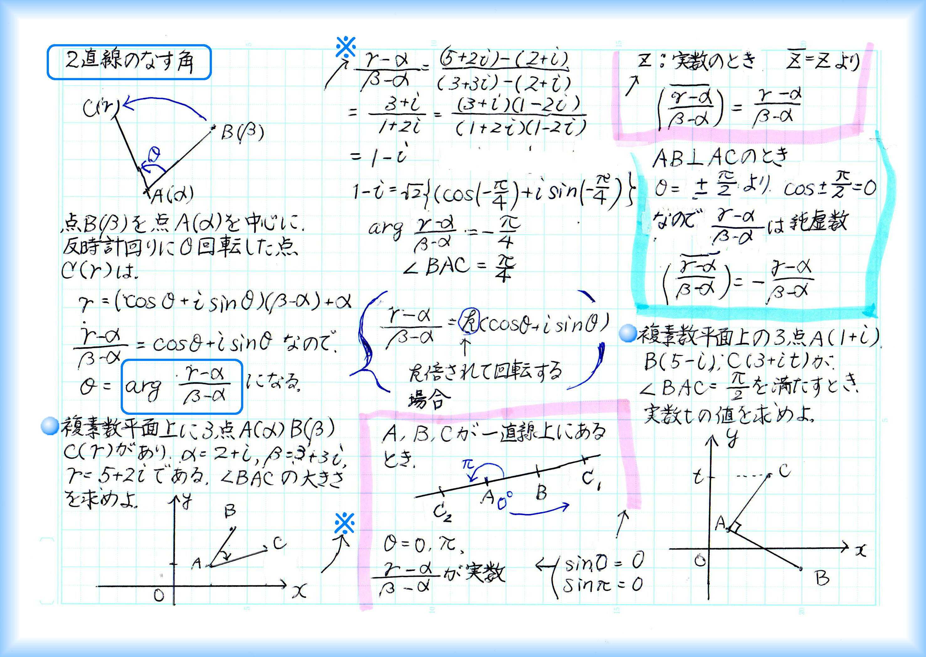 α、β、γが一直線上にあるとき、角度は0またはπなので、γ-α/β-αは実数です。(isin0、isinπとも0になるため)