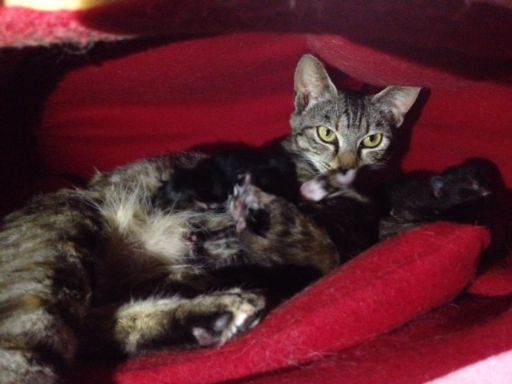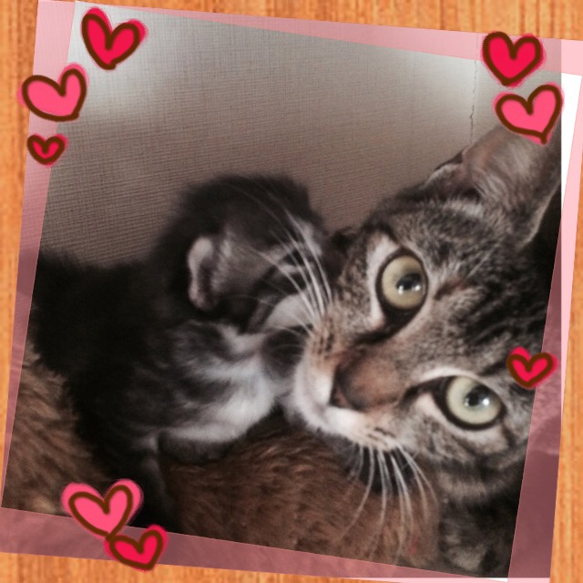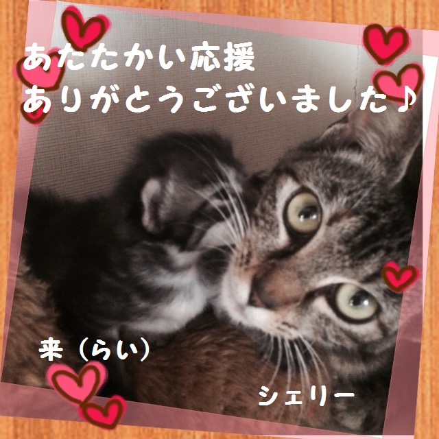 「アップルシード」のテラスに時々遊びに来ていた小さな野良ちゃんたち。いつも2匹で来ていたので、そのうち男のコの方を「メイ」女のコの方を「シェリー」と勝手に名前をつけて呼んでいました。人懐こいコたちだったので、抱っこさせてくれるくらい慣れてくれたら、うちのコとして迎えてとりあえず避妊手術しないとどんどん増えちゃうよね、なんて話していたんですけど、6月の大雨の夜、普段は夜に来ることはないシェリーがビショビショに濡れながら、窓越しにニャーニャー鳴いていたのです。あまりにも必死なカンジが伝わってきたから、「どうしたの?」と窓を開けると、家の中に入ってきて、そのあと外に出て行く様子もなく・・。でも、外は大雨だし、ま、いいか♪と、そのまま朝までおいてあげることにしました。翌朝様子を見に行くと、シェリーはちゃっかりとカルビのお気に入りの「いちごのベッド」の中に・・!中が暗くてよく見えなかったけれど、なんだかお腹の辺がワサワサしてるなと思ったら、赤ちゃんを産んでいたのです・・・っ。野良ちゃんってこっそり人目につかない場所で赤ちゃんを産むんじゃないの?と、かなりビックリしましたがシェリーは、「あ、赤ちゃん生まれました♪ わたし、ちょっとお腹が空いたんで あとでごはんよろしくね♪」とでも言っているかのようで、その日からごく普通に家の中でシェリーの子育てが始まりました。そんな訳で、「突然」ニャンコが増えましたが、いろいろとあったのですっかりお披露目するタイミングを逃し、今日に至りました。では、あらためまして、ちびニャンたち、6月26日生まれの現在生後2か月半です。男の子1ニャンと女のコ2ニャンと思っていたら、こないだ病院で、全員女の子だと判明しました(汗)来(らい)、福(ふく)、笑(しょう)。ひとり、男の子っぽい名前がついているのはそのためです しょうちゃん、ごめん・・・。という訳で、急に加わった新しい家族たちもどうぞよろしくお願いします ◆ ◆ ◆ ◆ ◆いつもポチっ!の応援ありがとうございます♪ 励みになります!