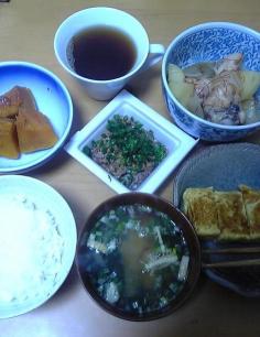 最近、和食を口にする機会が多いのので、今晩もやっぱり和食♪メニュー:新米・油揚げとワカメのお味噌汁・ダシ巻き卵・かぼちゃの煮物 手羽先と玉ネギ、じゃがいもの煮物・納豆(鰹節&ネギ入り)お茶: プーアール←卵が乗ってる器は私が作りました♪今日は久しぶりに充実した食生活でした♪でも…やっぱり、自分で作っても何となく味気ない(; ;)ご飯は皆でワイワイ♪そして、贅沢を言えば作ってもらうと美味しいですよね?