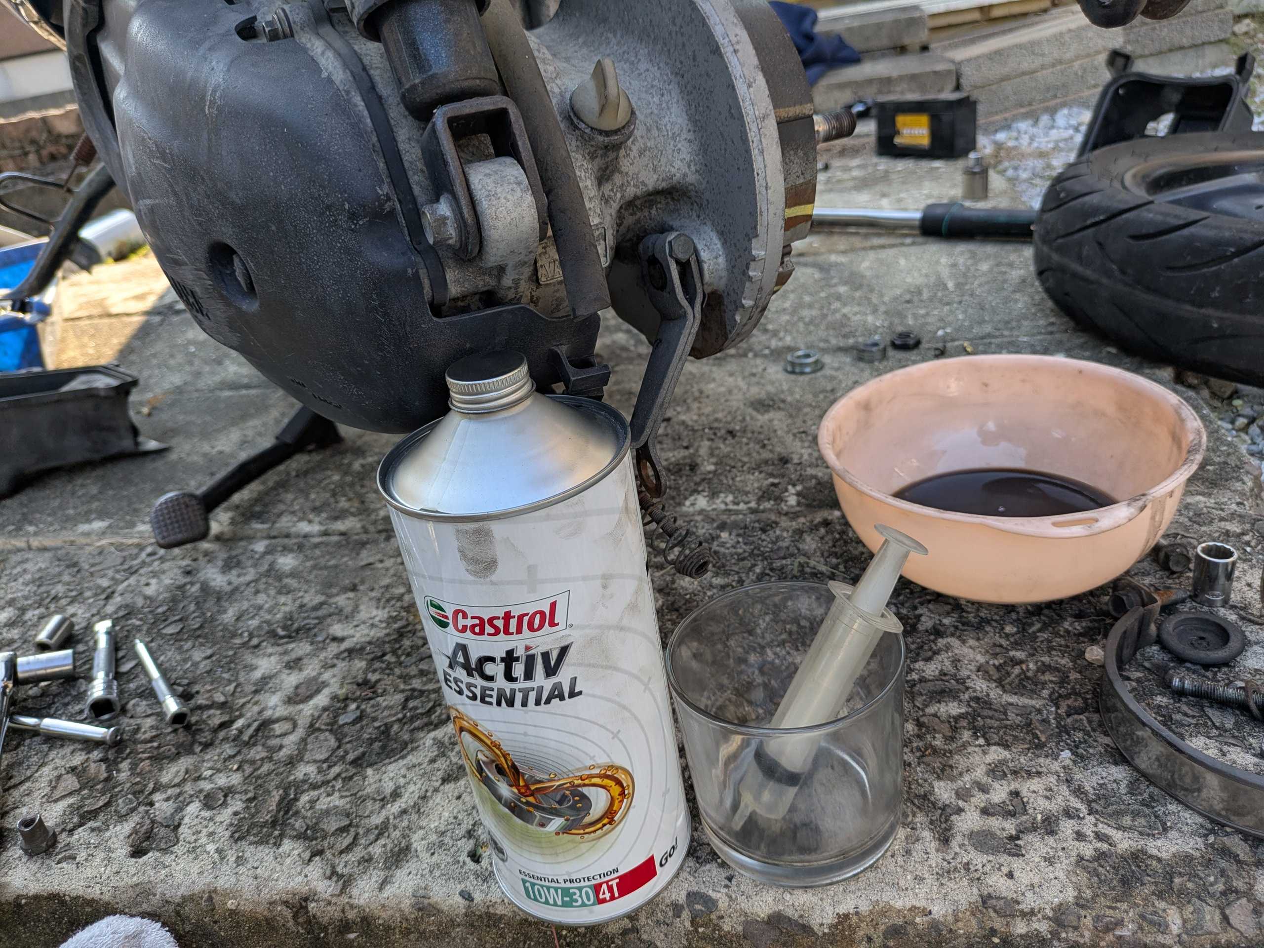 今、ヤマハ シグナス125 製作中です。新品エンジンオイル注入しました。ギヤオイルも新品交換しております。
