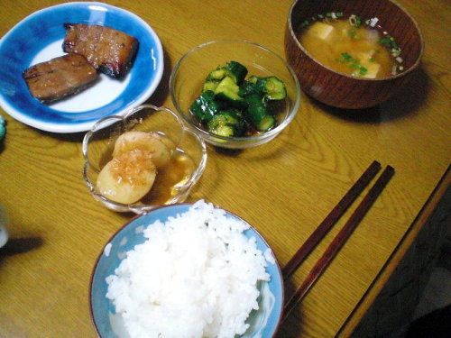 炊きたてご飯と味噌汁 昨夜の残りの新じゃが煮 叩きキュウリ まぐろみりん干さぁ~ これで今日もがんばるぞ~