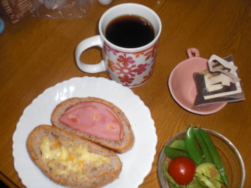 点々と赤いのは、タバスコ 朝は6時過ぎに起きますが、今朝は生暖かい風が吹いていました 買ってあったくるみパンでオープントーストを作りました サラダはサトウインゲンをレンジでチンして出来上がり 簡単サラダです 関東地方は強風ですが小雨程度です。