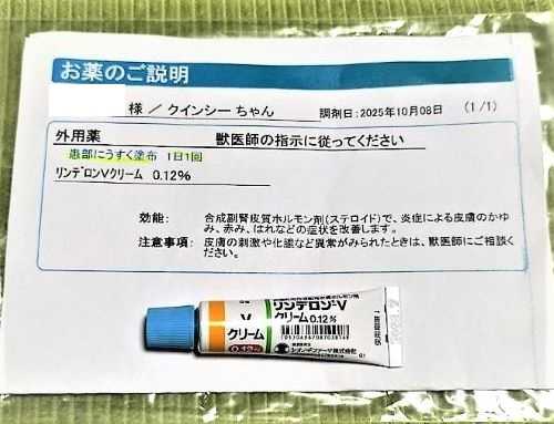く~ちゃんの様子がおかしい、どうしたの? 熱がありそうく~ちゃんの熱の原因は、これだった?頭に傷、全身に毒が回った結果の熱?・・・病院へ動物病院へ・・・予想外の体温、それでは不調の原因は?2025.10.8、く~ちゃん血液検査をしました 血液検査の結果血液検査の結果は、異常なし・・・それでは何の病気? の続き。10月8日、処方してもらったお薬。 ↓これは、今回の傷の薬ではなく、昨年6月30日に発症した、お耳の出来物の薬。 こちら数日で治っては、しばらくしてまた出来るの繰り返し。今回病院に行ったついでに、お願いして出してもらった。これを塗っても治るかどうかわからないと言われた。でもいいの、お耳に出来るたびにかわいそうで、何もしてあげられないのが辛かったから。もしかすると、早く治まるかもしれないし。頭の傷を見つけてびっくりして病院に行ったのに、その傷は大した事はないので、そのままでいいと言われて、薬も出なかった。傷のせいで熱が出ていると思って慌てたけれど、熱も平熱で、まったくの私の見当違い。嘔吐・食欲不振は、胃腸薬を出しましょうかと言われたけれど、多分違うと思って、お断りした。なので、せっかく病院に連れて行ったけれど、よい意味で何もなかったので、1つくらいは収穫がないとね。後は、今後嘔吐が続くか、食欲は戻るか、その結果で、また診察予約をする事になりました。実際は、21,290円。LINEポイントがたまったので、初診料から500円値引きで、支払額、20,790円でした。 にほんブログ村 ↑クリックして応援して頂けたらうれしいです ↓ ロシアンブルーランキング