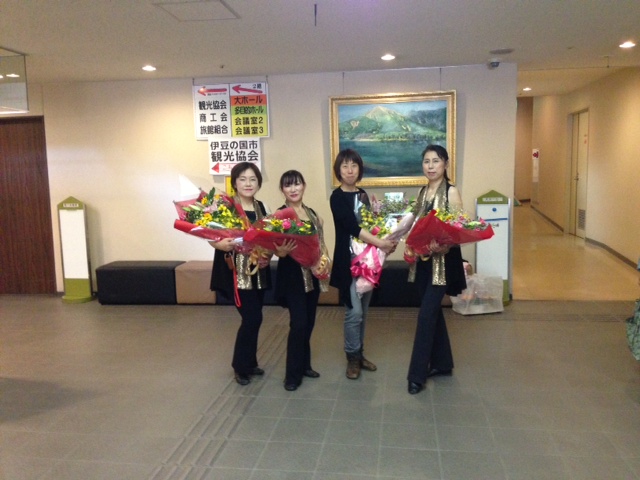 先日行われた、「伊豆の国市文化祭」発表が無事!?終わって、ロビーで記念撮影!(ほかの皆さんには、許可取ってないですが…勝手に掲載!ペコリ)向かって一番左が、私です!(2曲目の衣装)152センチ(自称)そして、右から2番目が、先生!花束その他で、うまく体型カバーしてますねいや~無事終わってよかった~! 今回、「スーパーマームズ」の代表として、色々踊り以外のことに頭が行ってしまい…わたくしとしたことが、普段間違えないところで、ミスってしまうという!特に1曲目は、ウィッグ(しかも金髪)を被ったため、そこに気になって、ボロボロでも、見に来ていただいた方からは、「笑顔でよかったよ~!」と、お褒めの言葉をいただき、(#^.^#)照れるな~。他にも「なんでやめちゃうの?」「上手いのに~」「一番うまかったわよ!」などなど、感謝です!これからどうしようかな…。さみしいな~。
