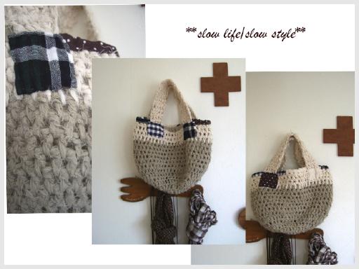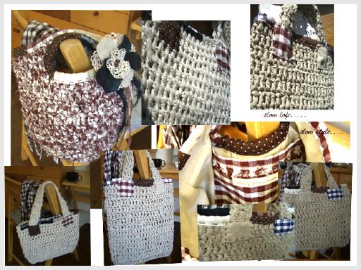 え~~~~~。。。みなさんの所になかなか行けません。。。コメントも入れられず、読み逃げになってしまうかもしれましぇん。。でも、こうやって読みに来て下さって、本当に感謝感謝ですぅ~☆**********************今、大阪のイベント用に作品作りに集中してます。。。家事も最低限で頑張ってマス。。オーダーのお品も必ず期日までにはお作りしますので、少々おまちくださいね**********************裂き布のバッグ。。。みー太郎ちゃんから、メッセージで「come home!の青木さんの持ってるバッグ♪」おぉ!!可愛い!!早速まねっこしてみました♪なんともいえない風合い。。。Wガーゼを1枚に開き、そして裂いて編み編み。。。自分も欲しいですが、(笑まずはイベント用にしてみます。難点が。。。とっても生地を使うって事。この大きさを作るのに、2mは要します。でも、この風合い。。(しつこい~^^;)何点か作って発送しようかな~と思ってます☆みー太郎ちゃん、ありがとう~☆*********************コサージュチャ系、BW,レース。。。バッグやお洋服にも。。。*******************と言う事で、まだまだ頑張ります!