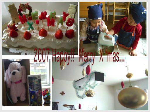 本日6日、日曜日。。。みなさん、明けましておめでとうございます。。。2008年がもう、始まってますね!みなさんにおかれましては、きっと家族で初詣や、親戚廻り、買い物等楽しいお正月をお過ごしの事と思います。。。2008年もステキな事が沢山あります様に。。。そして、ステキな出会いが沢山あります様に。。。****************************我家は年末、デジカメ故障という悲劇に見舞われたのですがクリスマスの画像が残ってたので、ここで載せさせて頂きます!(自己満足なんで、すいませんねぇ~(笑)恒例のクリスマスケーキとサンタさんのプレゼント。。。そして今回は、お部屋に格安で売っていた、オーナメントを天井から垂らしてみました♪旦那いわく。。。「こうゆう安っぽい店、よくあるな。。。」どんな店よぉ!!と思いつつも、そんなコメントはスルーだよ☆お騒がせした次男のプレゼントも前日、お友達宅で遊んだ時、放さなかったルービックキューブにしてみました。。無論、誰も揃える事出来ず。。。(汗***************************今年は「自粛なお正月」でした。鏡もちや、お飾りもナシ。。。。義理母の体調もよろしく無くて、、、少々ブルーなお正月。。(私は。。)子供達は毎日、楽しそうに騒いでいます。3人産んで良かった~。。。とつくづく思う瞬間。***************************オーダーのお品。。。大人用ポンチョ。ケープ?。。はい。前でリボン結び出来ます。それと、レッグウォーマー♪ポンチョは「長めで、からし色を入れて。。」とのオーダーでした。腰に巻けば、オーバースカートにも出来そうですよ極寒の北海道のお友達のお友達。。。これでシバラクはぽかぽかですよん♪デニム系にピッタリです☆レッグは前に娘ちゃんにも作りましたのでおソロになります♪ 可愛い~ひゅ~♪(笑こちらは、義理母様へのプレゼントだそう。。生地、悩みましたあぁ~。。。マダムですから、少しシックな。。。でも、可愛らしぃ感じ。。。結果、フォークロア系の生地にしました。かなり濃いブラウン。大人なショルダーですこれに、人気の茶のドットマフラー。(これ、オーダー本人の品。。)***************************とまぁ、新年も関係なく、ハンドメイド。ニット帽も自分、旦那、子供、委託用と作りまくってますそれはまた、次回の日記にて。。。。***************************オーダーのお品、は明日、定型外での発送になります♪しばし、お待ちを。。。。***************************2008年、こんな感じでスタートの私。明日は学校、明後日は幼稚園が始まります。さぁ~、、、張り切って行こうね、 jinnファミリ~!
