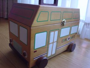 =お気に入りの一品=私がほぼ、即決で決めて、うちにきたものです。フリマだったかな~。いつも見かけるお店の方が出してました。かわいい!!!ヘ(^^ヘ)))。。。もうまずは手にとって、なかをたしかめ。探していたんです、このとき。裁縫道具箱。(*^_^*)本物は高いんです。そしてかさばる。('';)ウーンまあコレもかさばりますが、かわいくってかさばるのは許せる私。開けてみたら、なかなか広い。小学校のときの既製の道具箱を卒業したあと(割れた)からずっと同じキキララのものを使っていたが、ちいさいうえに割れてしまっていた。息子が触っても危ないし。とどめを刺しても・・・・と思って、この時期かなり探していた。いくらだったろう~。おじさんとの駆け引きもすんなり。いくらですか?¥○○○○だよ。多分4桁ではあったはず。で、「じゃあ、うーん、うーん。いい!もらっていく」といったら、「お!いいかんじだね、はっきりしてて気持いい!まけちゃう」って何ぼかまけてくれたはず。とにかく、車って結構あるんですけど。正面から見ると、顔に見えません?これはわざと作ってると思いますが、大好きなんです。不細工でも、車がなんか顔っぽく見えるの。(#^.^#)で、即決。うっきうきで家に帰りました。今でも出すたびに、かわいいなーなんて。思ってます。本当に車も動くしね。ころころころがせます。はい?そう、たぶん本当の使い道は、これは薬箱。だから救急車っぽいんでしょうね。でも、ボタンが取れて走ってきてくれます。うちの場合。手術はへなちょこチョコ蔵ですけどね。。。。。。。あは。((((((^_^;)おしまい。